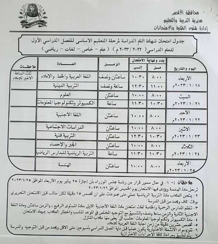 جدول امتحانات الشهادة الإعدادية في الأقصر