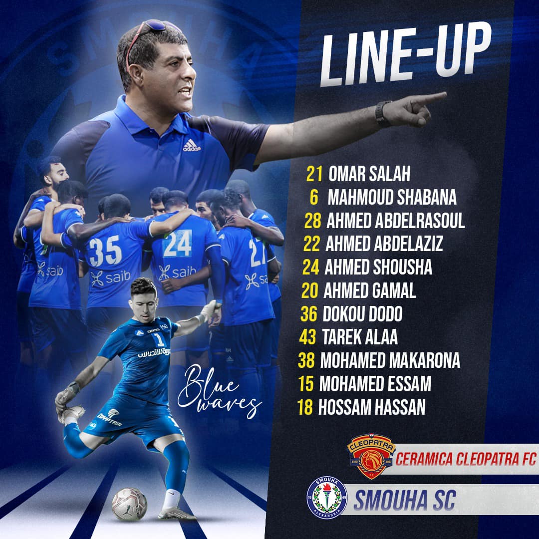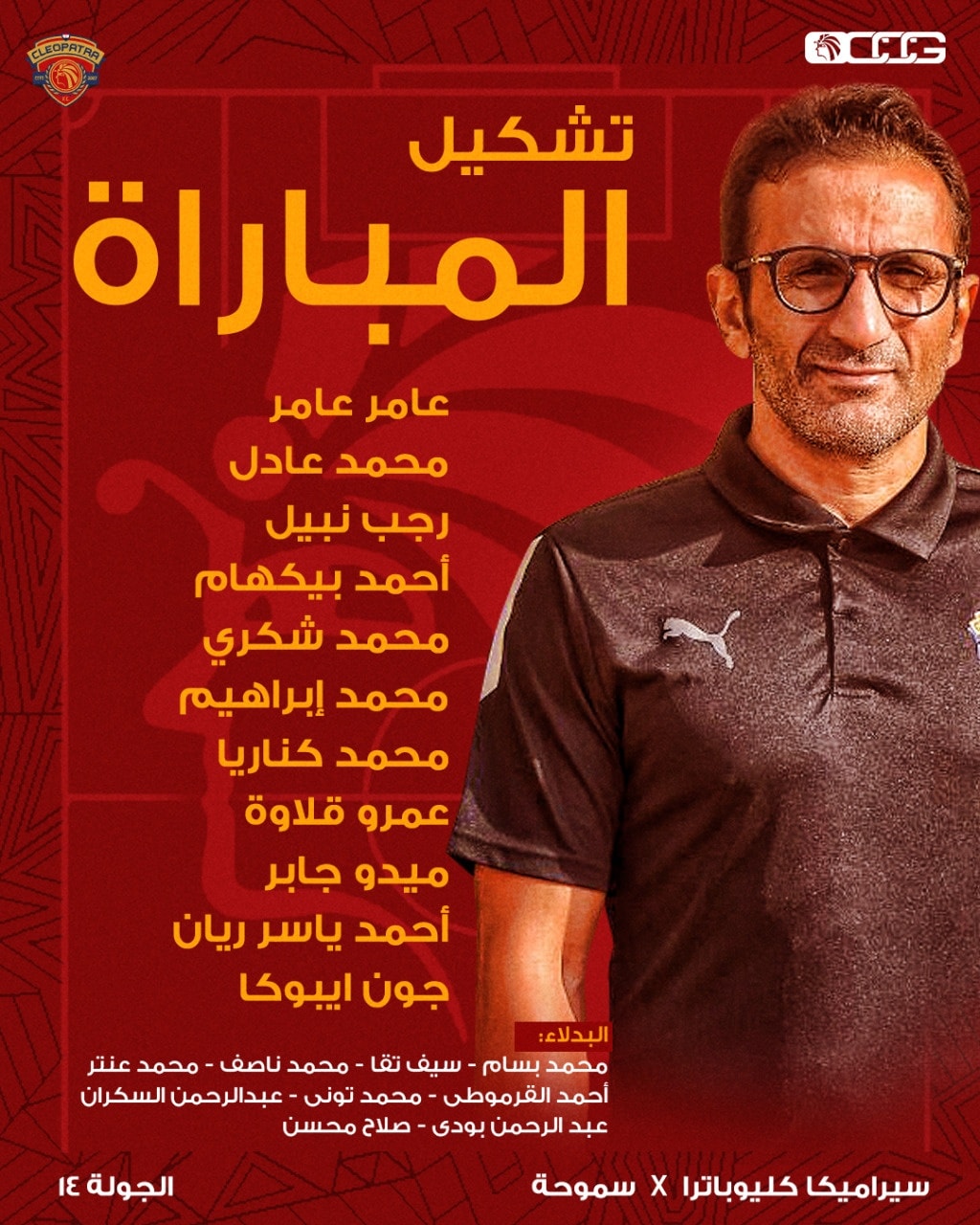 الدوري المصري، أعلن أحمد سامي المدير الفني لفريق سيراميكا كيلوباترا تشكيلة فريقه لمواجهة نظيره سموحة بعد قليل، باستاد القاهرة الدولي ضمن منافسات الجولة الرابعة من عمر بطولة الدوري الممتاز.