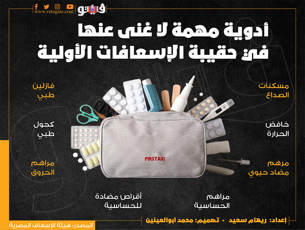 أدوية مهمة لا غنى عنها في حقيبة الإسعافات الأولية (إنفوجراف) الجمعة 03/مارس/2023 - 09:04 م 3/3/2023 9:04:12 PM أدوية مهمة لا غني عنها في حقيبة الإسعافات الأولية ريهام سعيد شارك طباعة 18 حجم الخط شارك طباعة الاسعافات الاولية حقيبة الإسعافات هيئة الإسعاف المصرية مضاد حيوي ريهام سعيد