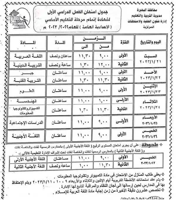 جدول امتحانات الشهادة الإعدادية 2023 محافظة البحيرة