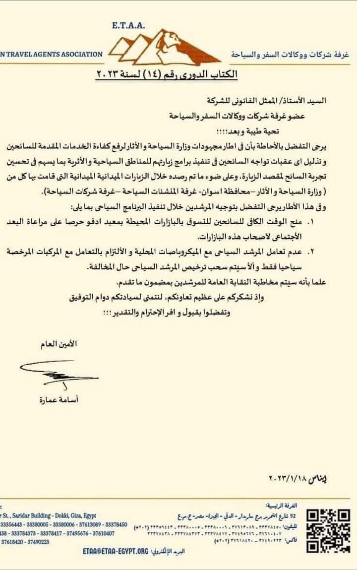 وعممت غرفة شركات السياحة، منشورا على الشركات أكدت فيه انه تم تشكيل فرق ميدانية تابعة لوزارة السياحة والاثار وغرفة شركات السياحة وغرفة المنشأت السياحية ومحافظة أسوان لبحث سبل تطوير تجربة زيارة السائحين للمناطق الأثرية والسياحية بمحافظة أسوان.