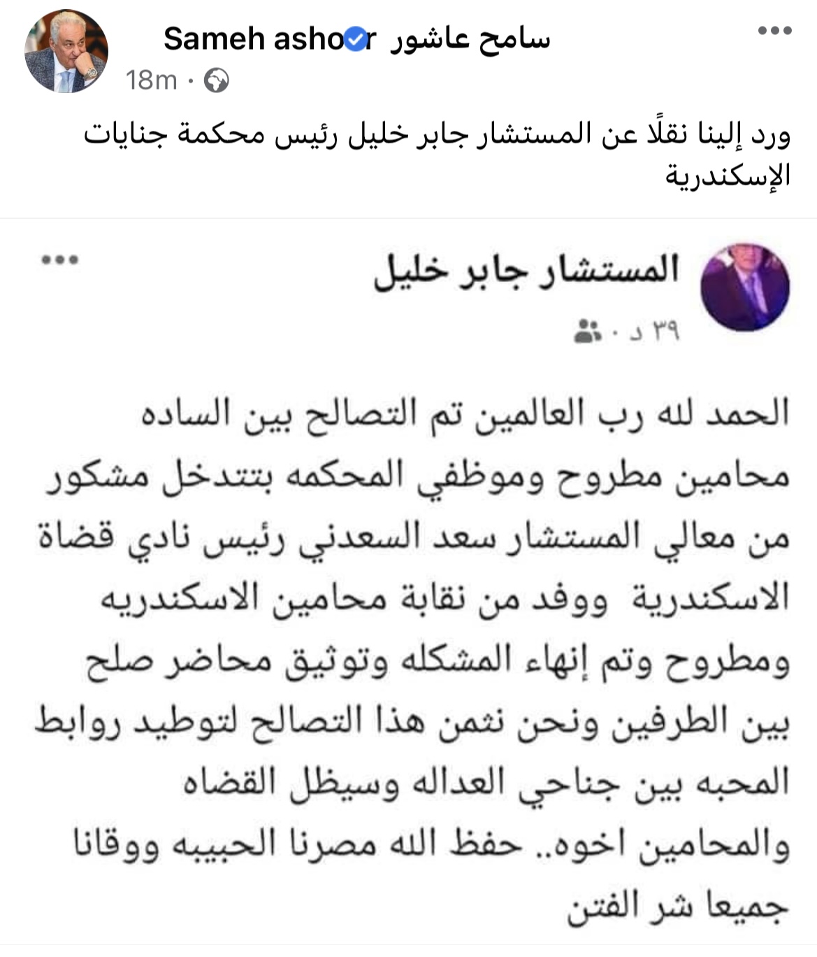 محامين مطروح، قال سامح عاشور، نقيب المحامين الأسبق وعضو مجلس الشيوخ، إن المستشار جابر خليل، رئيس محكمة جنايات الإسكندرية، أخبره بتدخل المستشار سعد السعدني، رئيس نادي قضاة الإسكندرية، ووفد من نقابتي الإسكندرية ومطروح لحل أزمة محامين مطروح، وبالفعل تم حل المشكلة وتوثيق محاضر الصلح بين الطرفين.