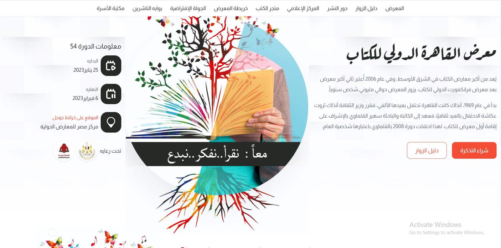 ويستقبل معرض القاهرة للكتاب في دورته الـ 54 زواره ابتداء من يوم الثلاثاء 26 يناير 2023، وينتظرهم حتى يوم الاثنين 6 فبراير، كل أيام الأسبوع من 10 صباحا إلى 9 مساء.
