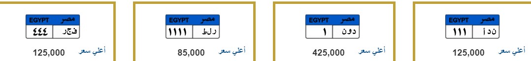 وضمت القائمة المطروحة: "ن د أ 111" بسعر 125 ألف جنيه، “د ون 1” بسعر 425 ألف جنيه، ”ر ل ط 1111” بسعر 85 ألف جنيه، "ف ج ر 444" بقيمة 125 ألف جنيه، "ع ل ى 99".