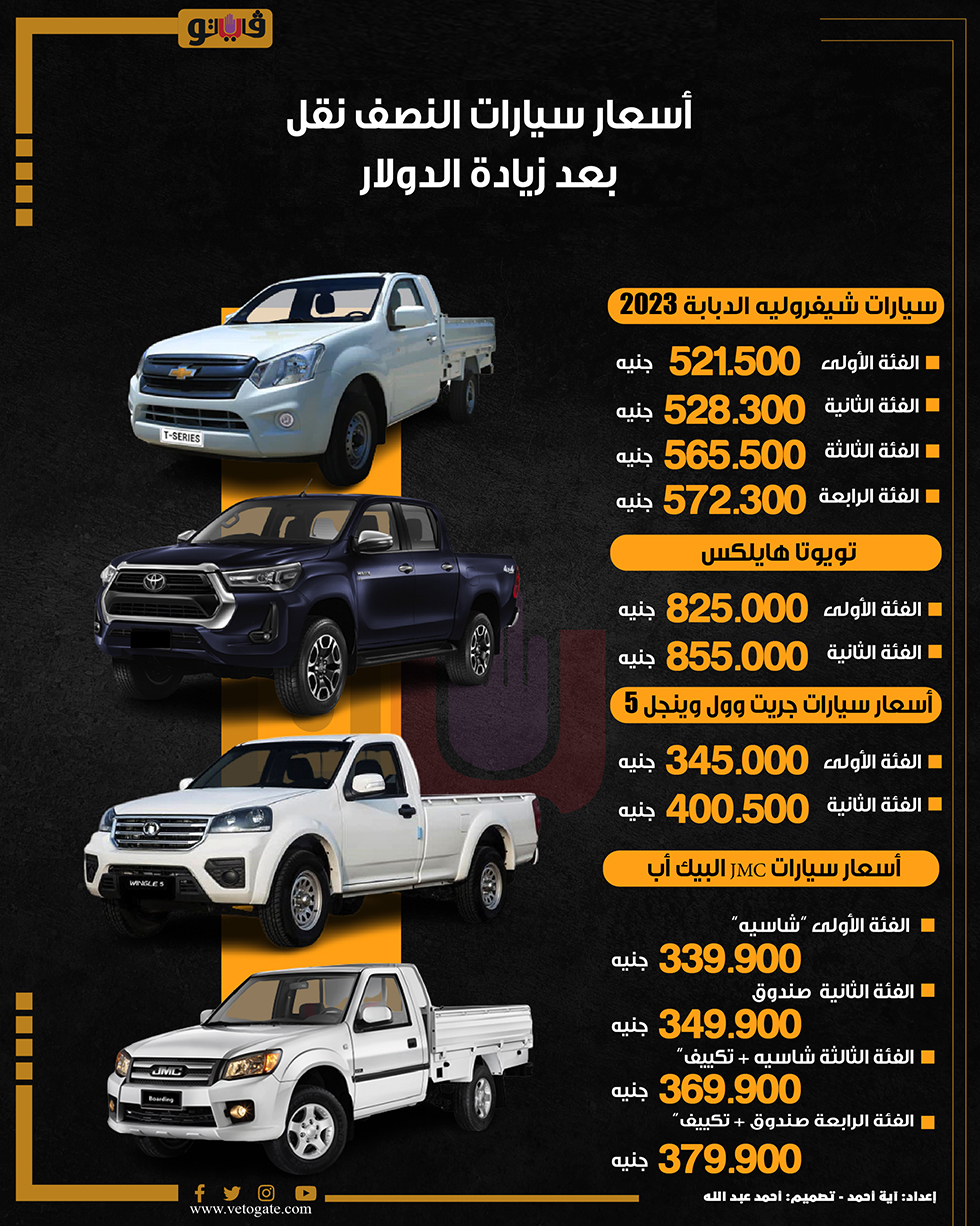 أسعار سيارات النصف نقل بعد زيادة الدولار (إنفوجراف) الأحد 22/يناير/2023 - 01:37 م 1/22/2023 1:37:35 PM أسعار سيارات النصف نقل بعد زيادة الدولار، فيتو آية أحمد شارك طباعة 18 حجم الخط شارك طباعة اسعار سيارات البيك اب اكسسوارات سيارات شيفروليه سيارات البيك اب سيارات شيفروليه الدبابة شيفروليه الدبابة
