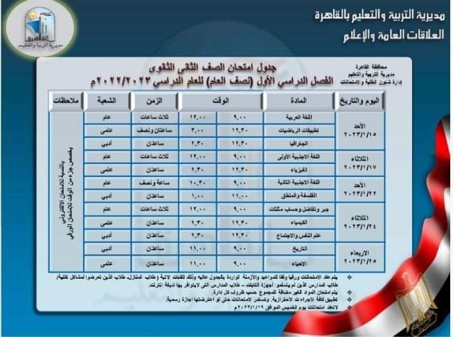 وأعلنت مديرية التربية والتعليم بمحافظة القاهرة، جدول امتحانات الصف الأول الثانوي للفصل الدراسي الأول للعام الدراسي الحالي 2022 /2023.
