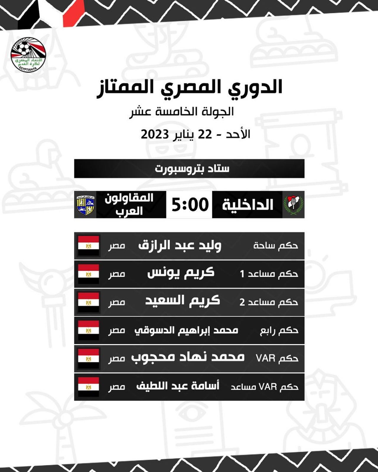 مباراة الغد تجمع فريق الداخلية مع المقاولون العرب، ويستضيفها استاد بتروسبورت وتنطلق في الخامسة مساءا، ويديرها طاقم حكام مكون من: