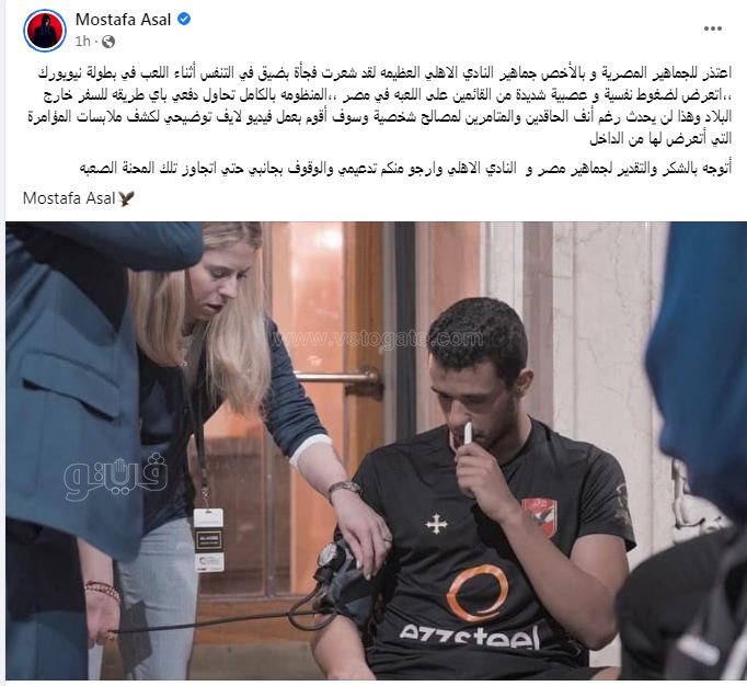 وجاءت رسالة مصطفى عسل كالتالي: اعتذر للجماهير المصرية وبالأخص جماهير النادي الأهلي العظيمة لقد شعرت فجأة بضيق في التنفس أثناء اللعب في بطولة نيويورك.. أتعرض لضغوط نفسية وعصبية شديدة من القائمين على اللعبة في مصر.المنظومة بالكامل تحاول دفعي بأي طريقة للسفر خارج البلاد وهذا لن يحدث رغم أنف الحاقدين والمتآمرين لمصالح شخصية وسوف أقوم بعمل فيديو لايف توضيحي لكشف ملابسات المؤامرة التي أتعرض لها من الداخل.