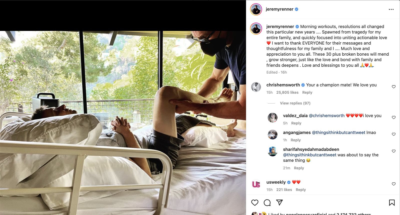 ونشر الممثل الشهير نجم أفلام مارفل جيريمي رينر، صورة له من المستشفى عبر حسابه الرسمي على موقع الصور والفيديوهات “إنستجرام”، يظهر فيها وهو نائم على السرير، والكدمات والإصابات تغطي وجهه وجسده.