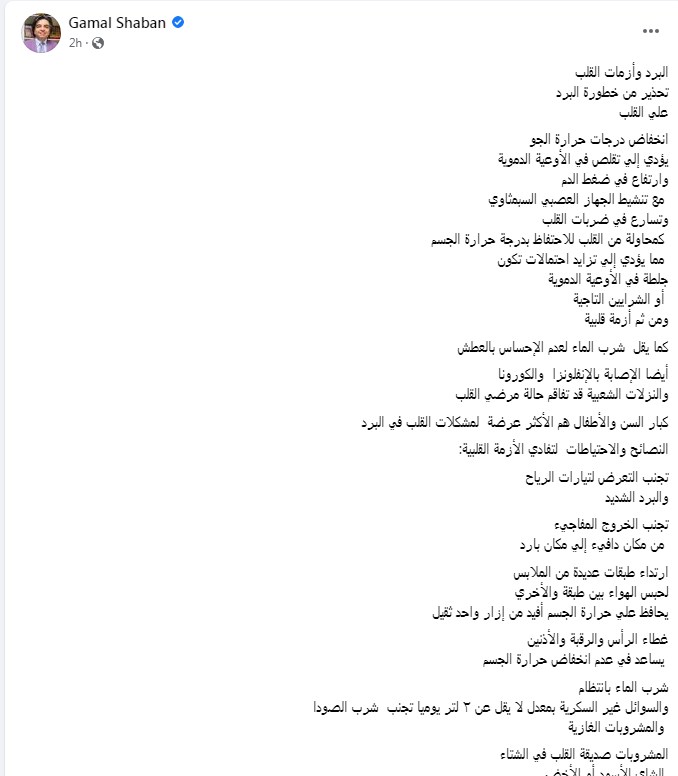 وحذر الدكتور جمال شعبان من تأثير البرد على القلب فقال: "البرد وأزمات القلب، تحذير من خطورة البرد علي القلب، وانخفاض درجات حرارة الجو".