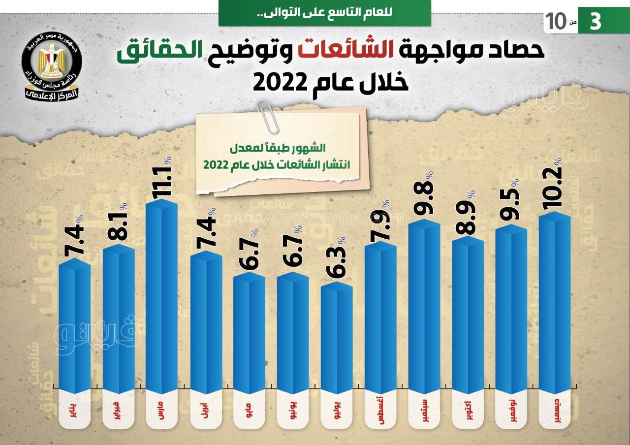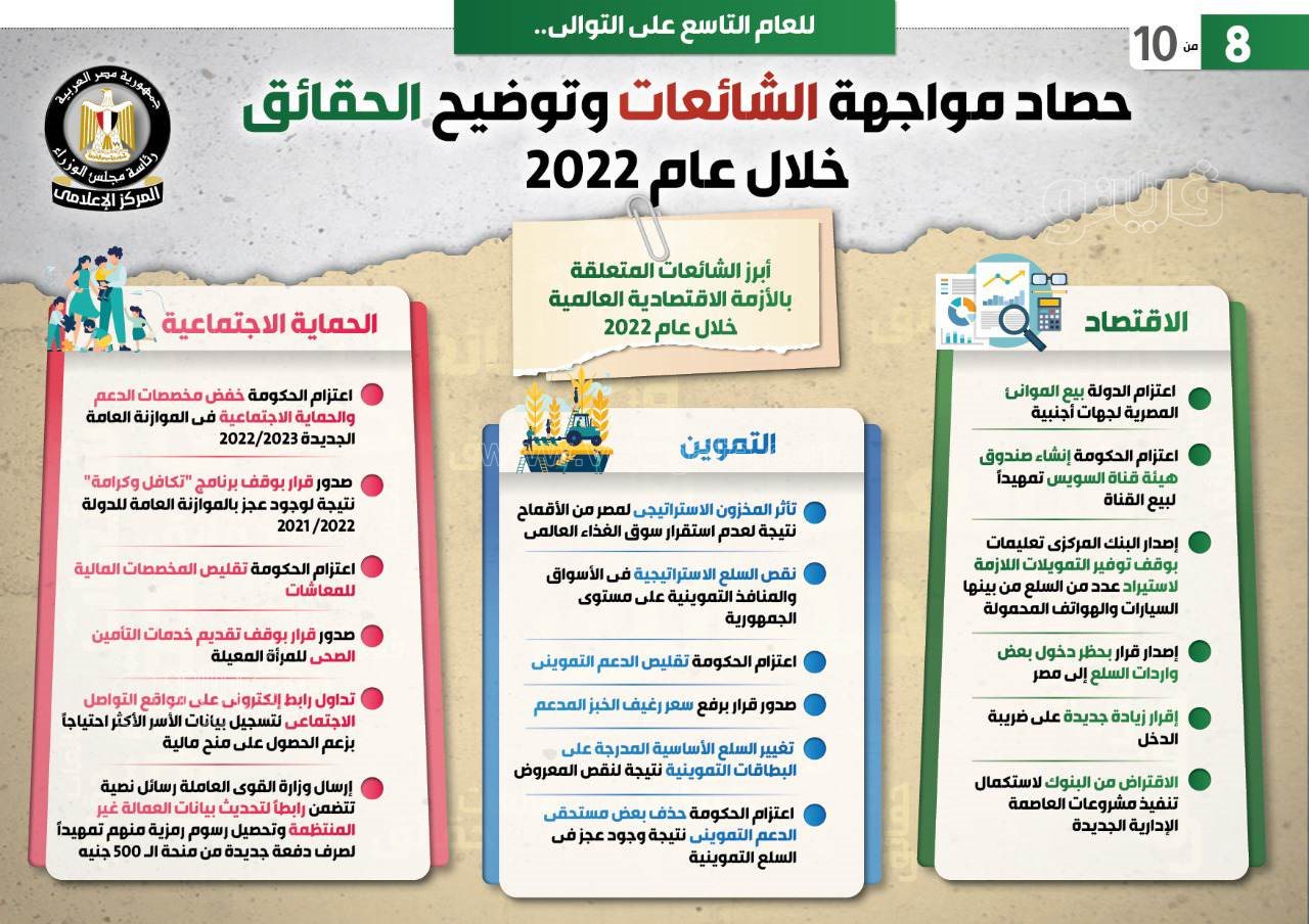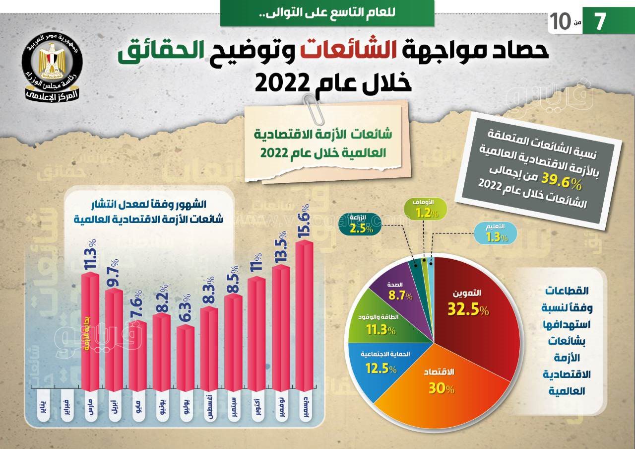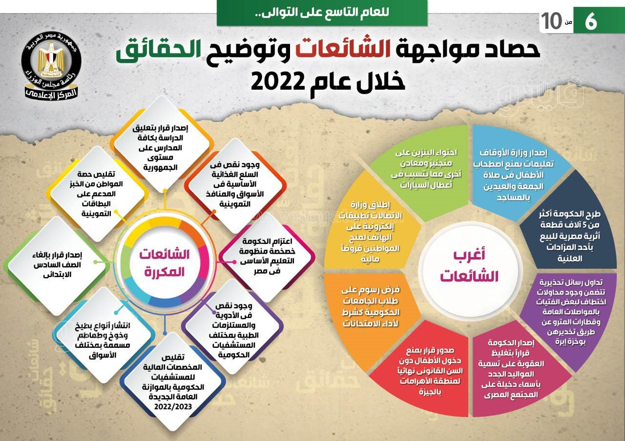 وفي هذا الصدد نشر المركز الإعلامي لمجلس الوزراء تقريرًا تضمن إنفوجرافات تتناول حصاد مواجهة الشائعات وتوضيح الحقائق خلال عام 2022.