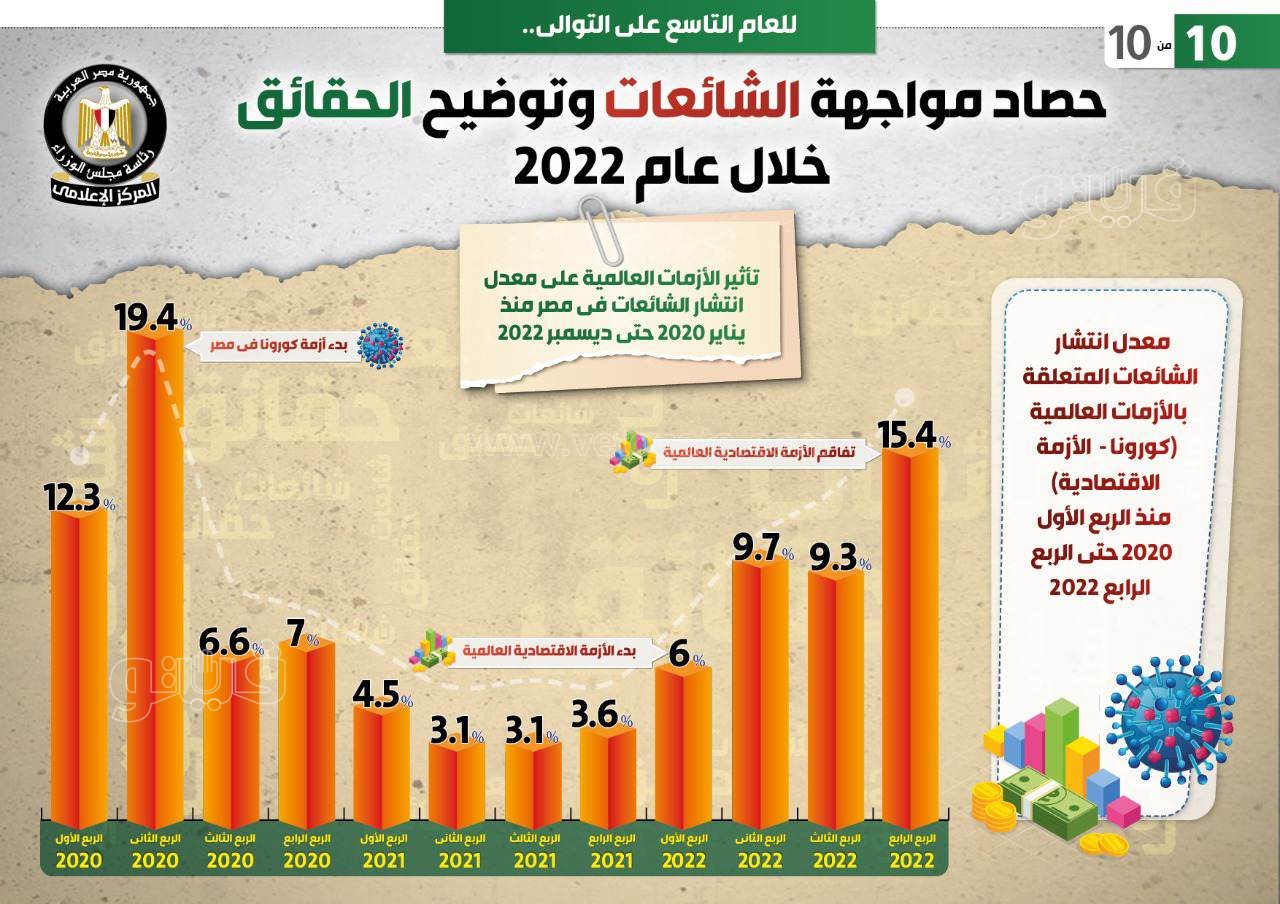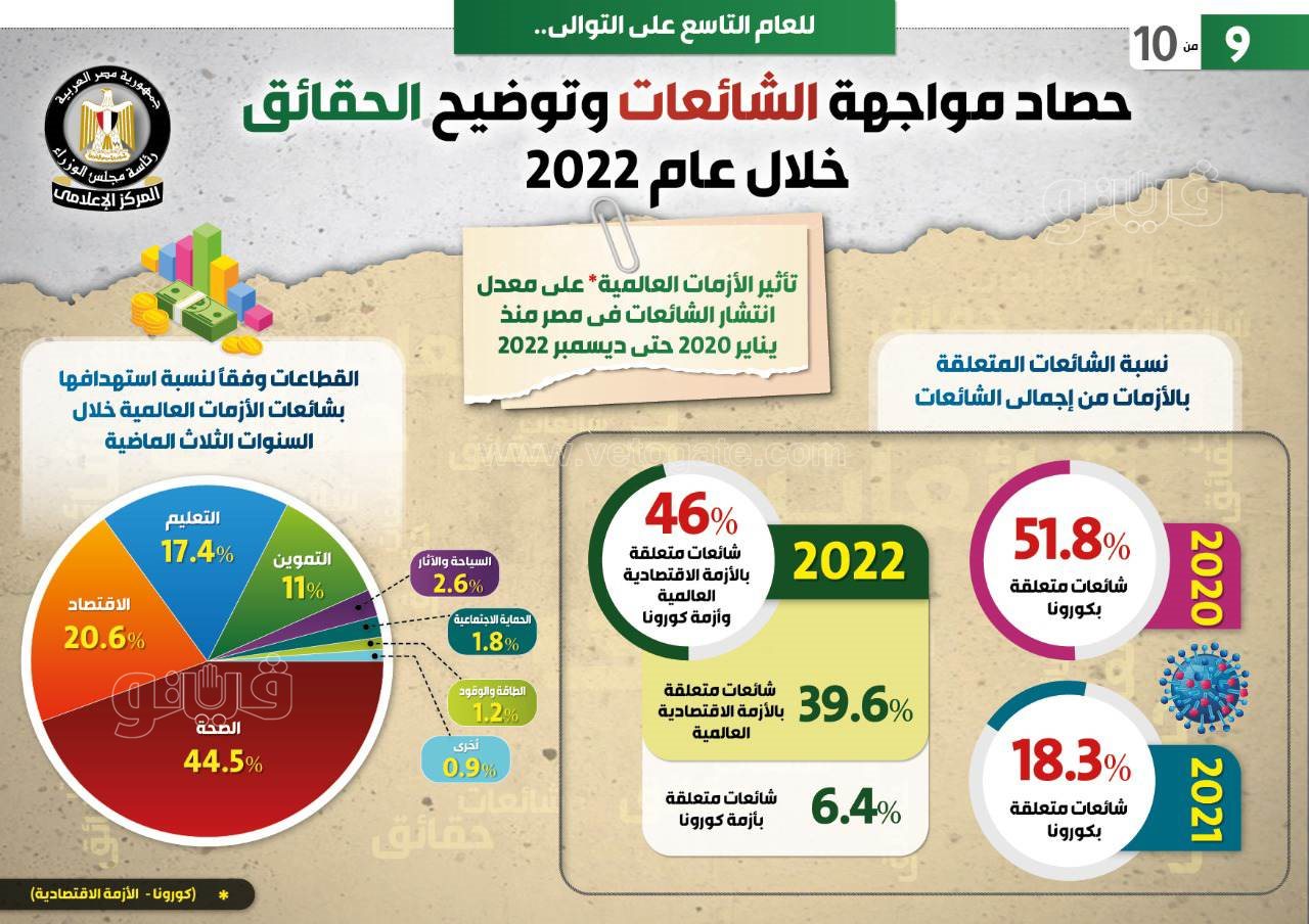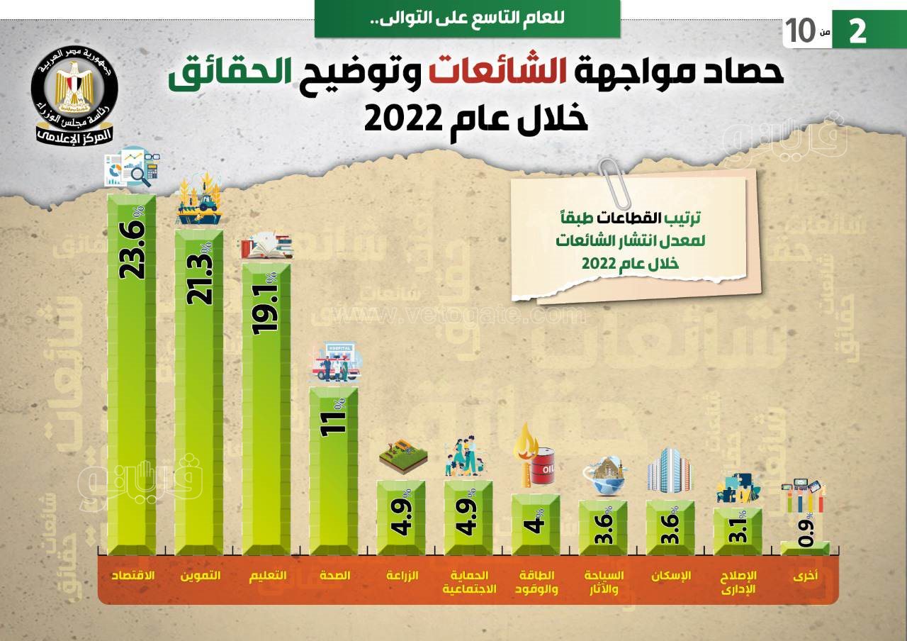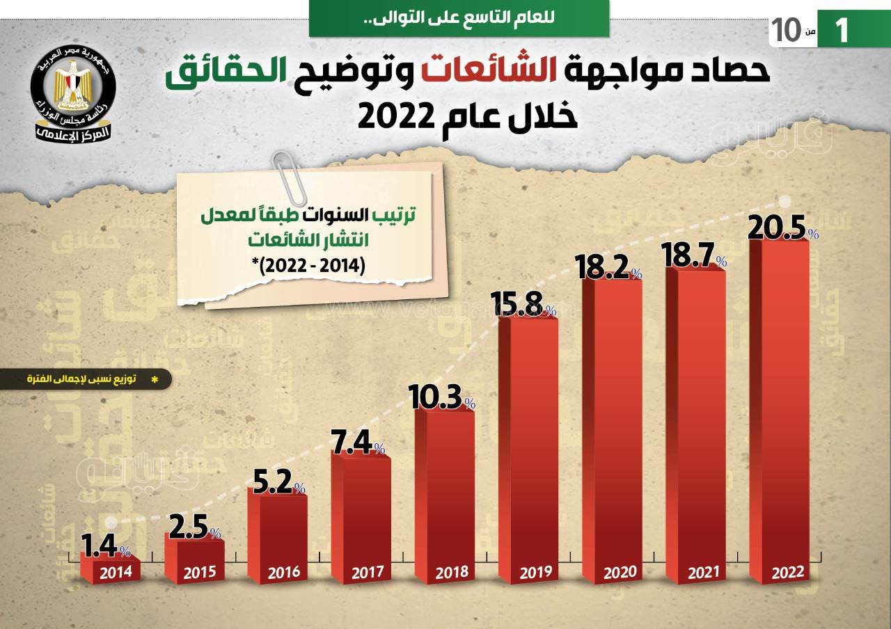 وفي هذا الصدد نشر المركز الإعلامي لمجلس الوزراء تقريرًا تضمن إنفوجرافات تتناول حصاد مواجهة الشائعات وتوضيح الحقائق خلال عام 2022.