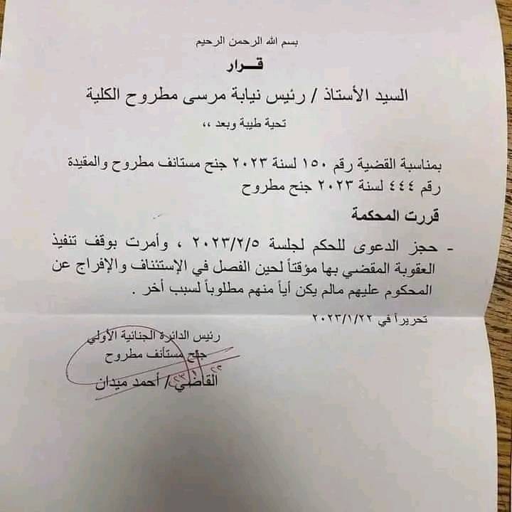 وقررت محكمة مطروح حجز الاستئناف المقدم من المحامين الـ 6 على حكم حبسهم عامين مع الشغل على خلفية واقعة تشابك بينهم وبين موظف بمحكمة مرسى مطروح الى جلسة النطق بالحكم يوم 5 فبراير مع إخلاء سبيل المحامين.