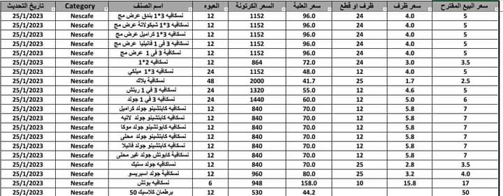 وجاءت قائمة الأسعار تتضمن "اسم الصنف - العبوة - سعر الكرتونة - سعر العلبة -سعر الظرف - سعر البيع المقترح