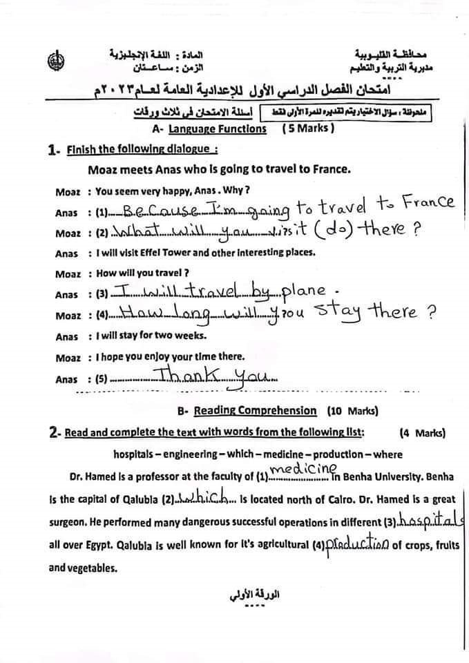 الإجابات النموذجية على امتحان اللغة الإنجليزية للشهادة الإعدادية بالقليوبية