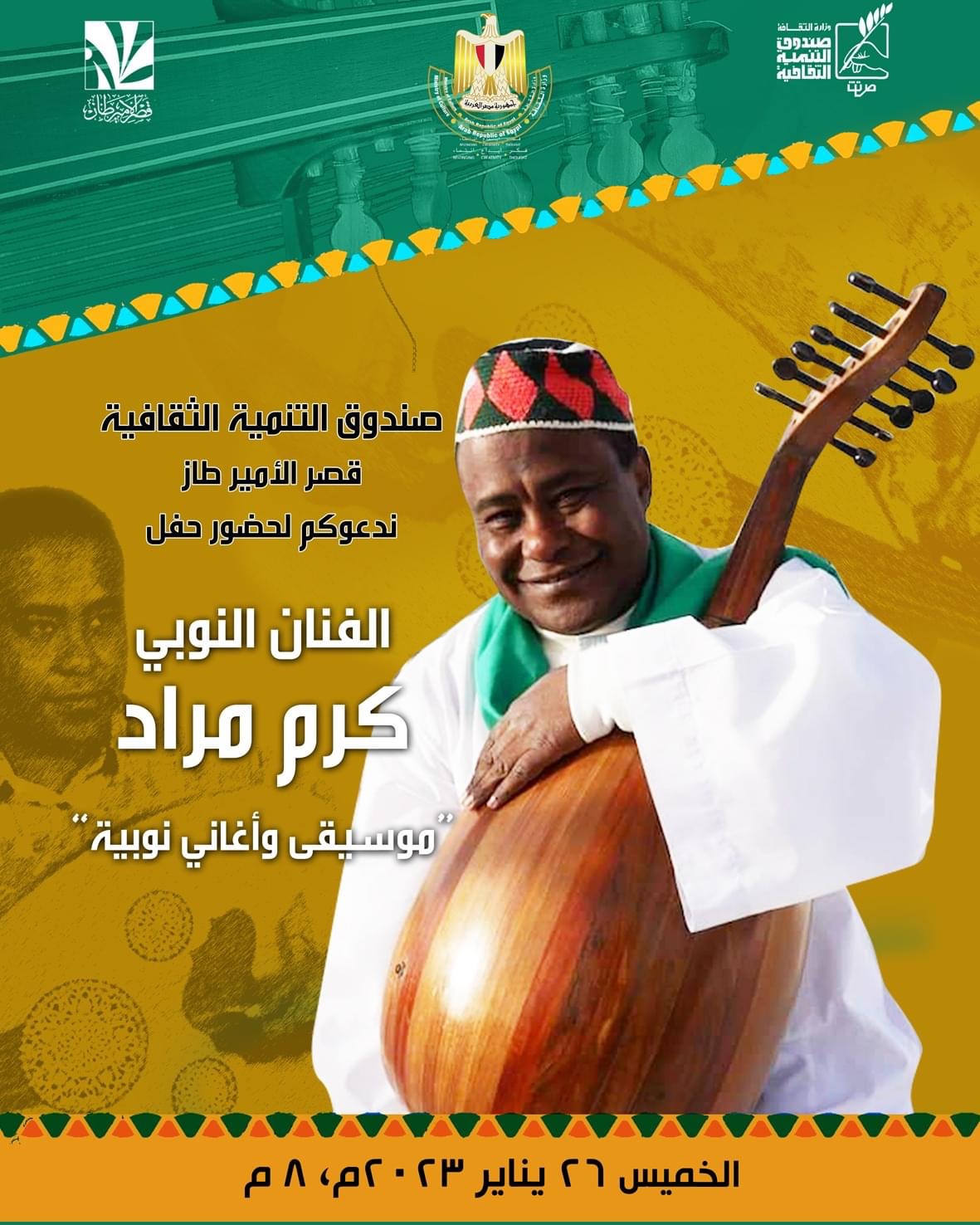 يستضيف مركز إبداع قصر الأمير طاز، والتابع لقطاع صندوق التنمية الثقافية، في تمام الثامنة من مساء يوم الخميس المقبل الموافق 26 يناير الجاري، حفلا فنيا للفنان النوبي كرم مراد.