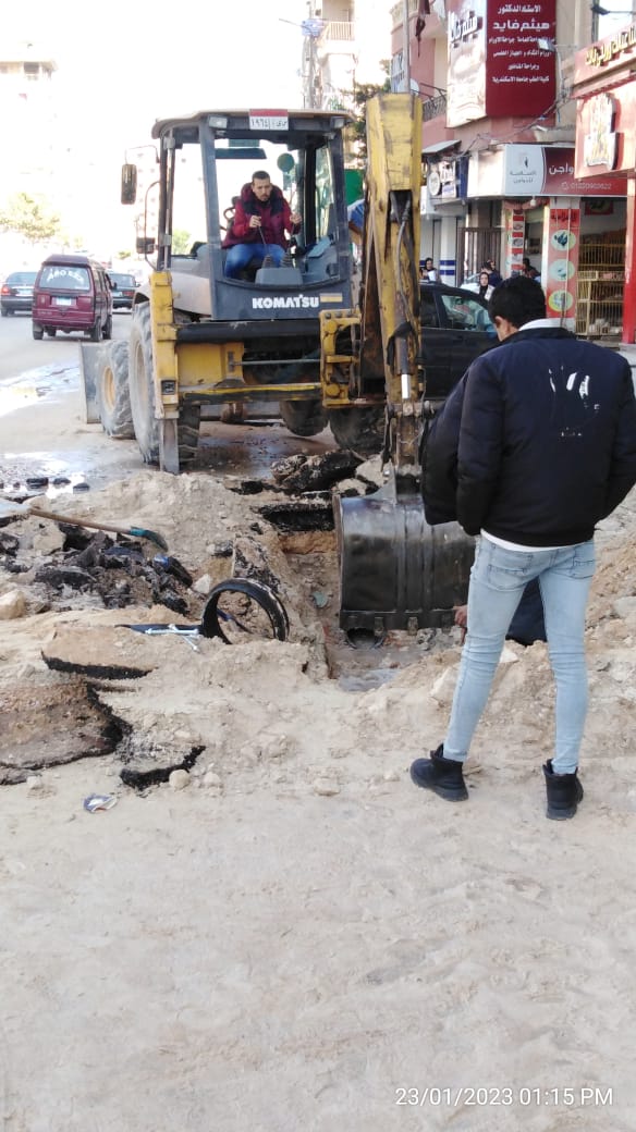 وشهد حي العجمي كسر مواسير ٣ مواسير بمناطق مختلفة، مما ادي الي قطع وضعف المياه بتلك المناطق