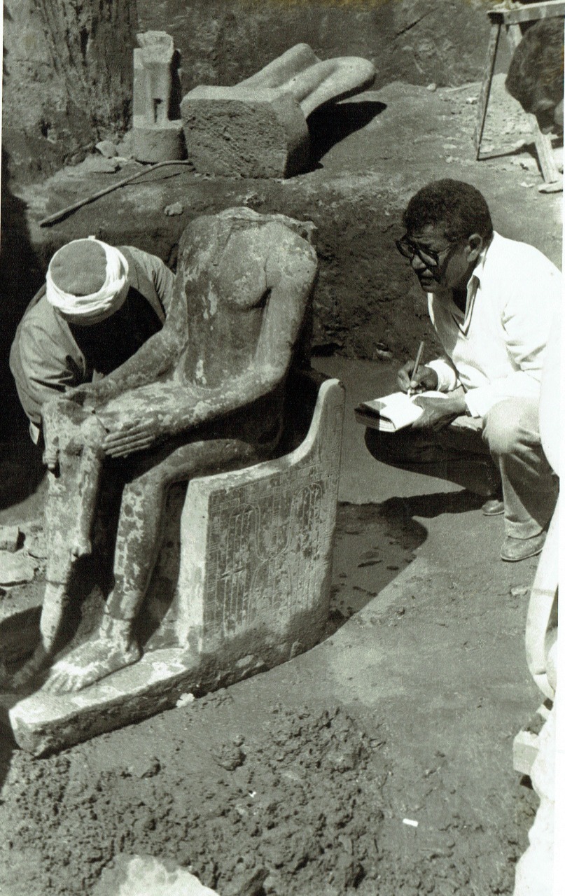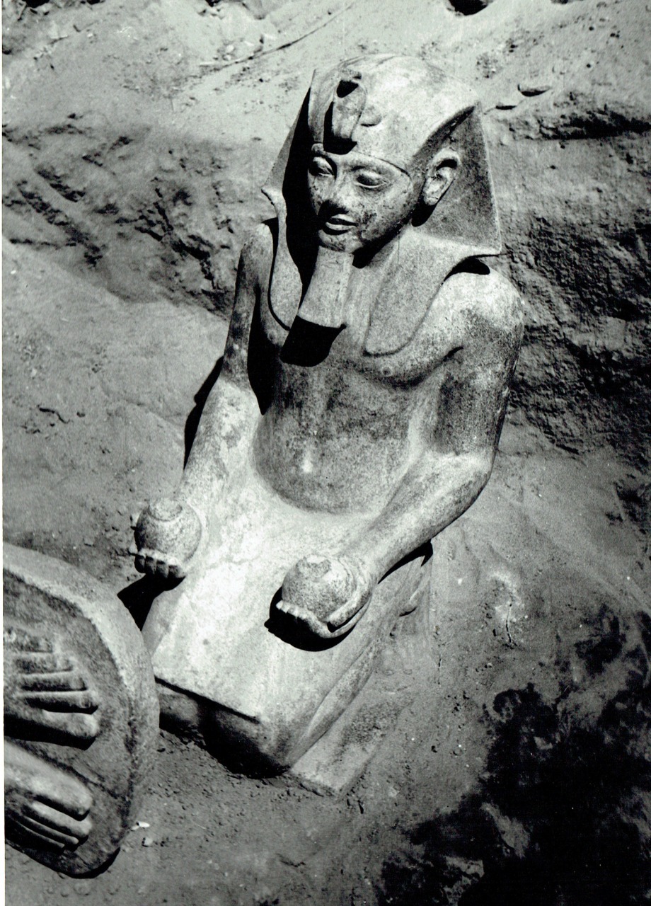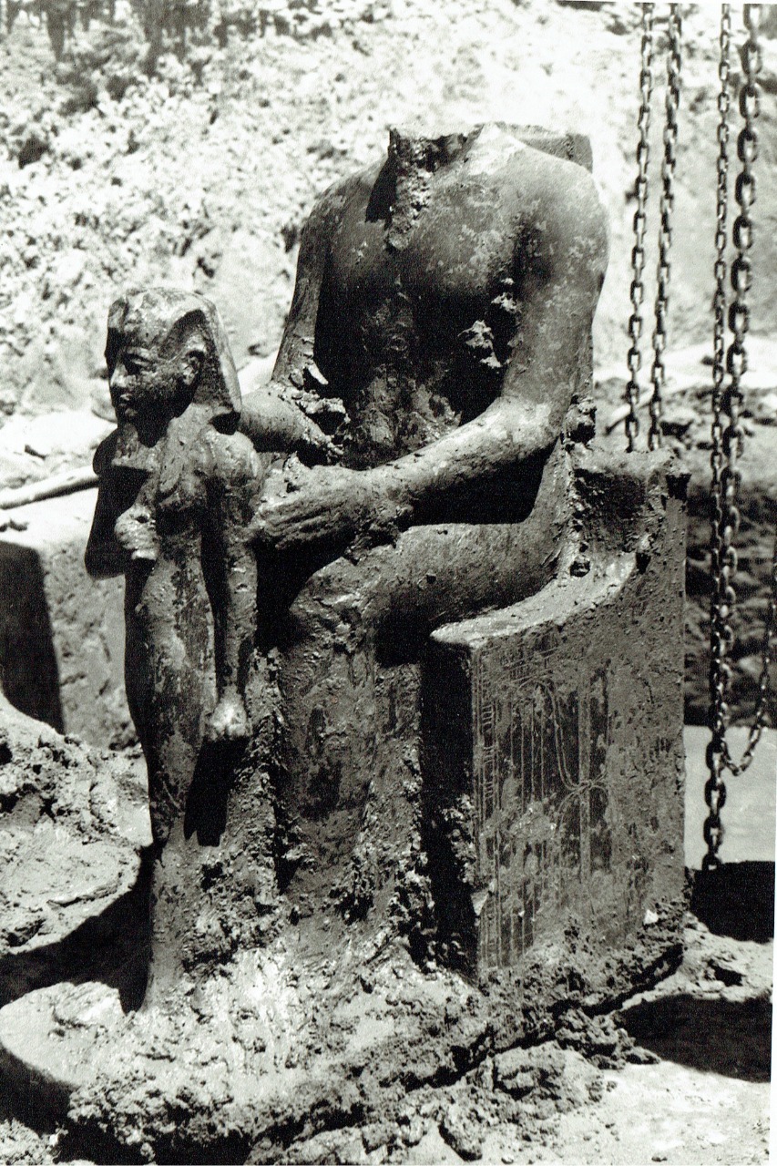 وأثناء أعمال التنظيف ظهرت حافة حجر مصقول من الجرانيت الأشهب على عمق طفيف، والذي اتضح لاحقا أنه قاعدة تمثال بطول 150 سم، ثم توالت الاكتشافات والتي أسفرت عن مجموعة من أروع نماذج فن النحت في مصر القديمة في حالة رائعة من الحفظ صورت عدد من الملوك والمعبودات، ويرجع أغلبها لعصر الدولة الحديثة.