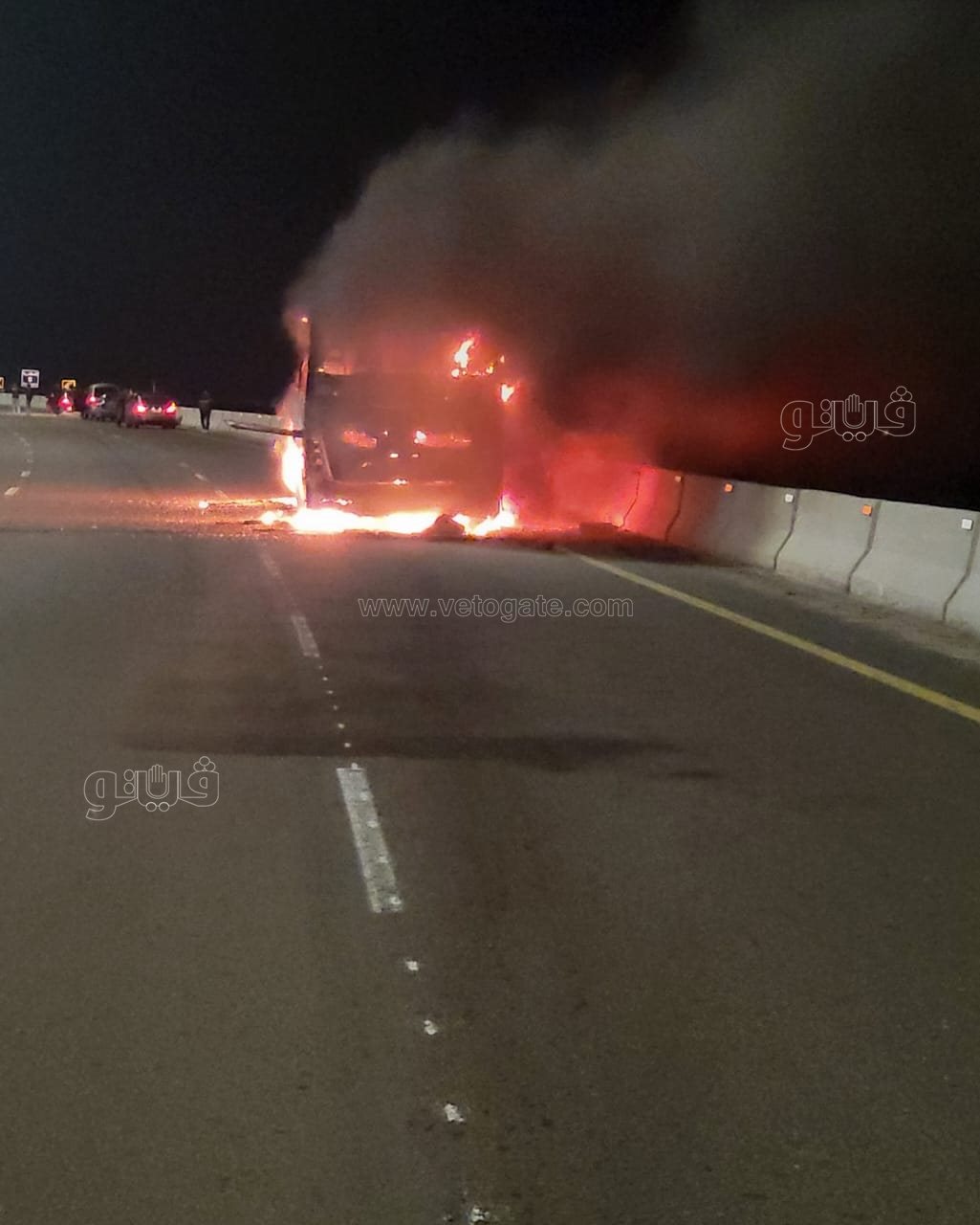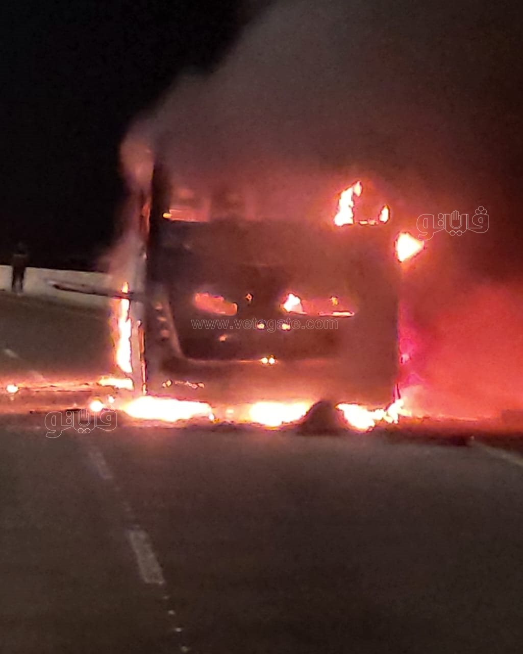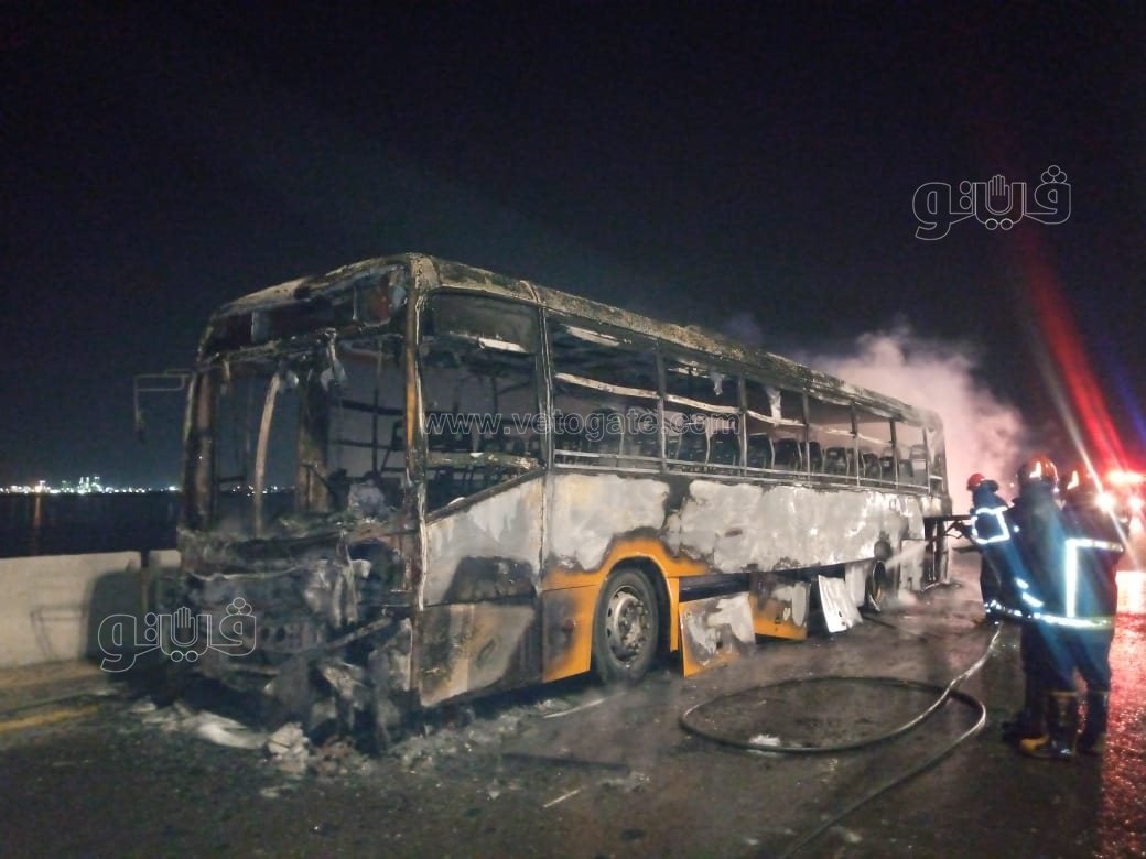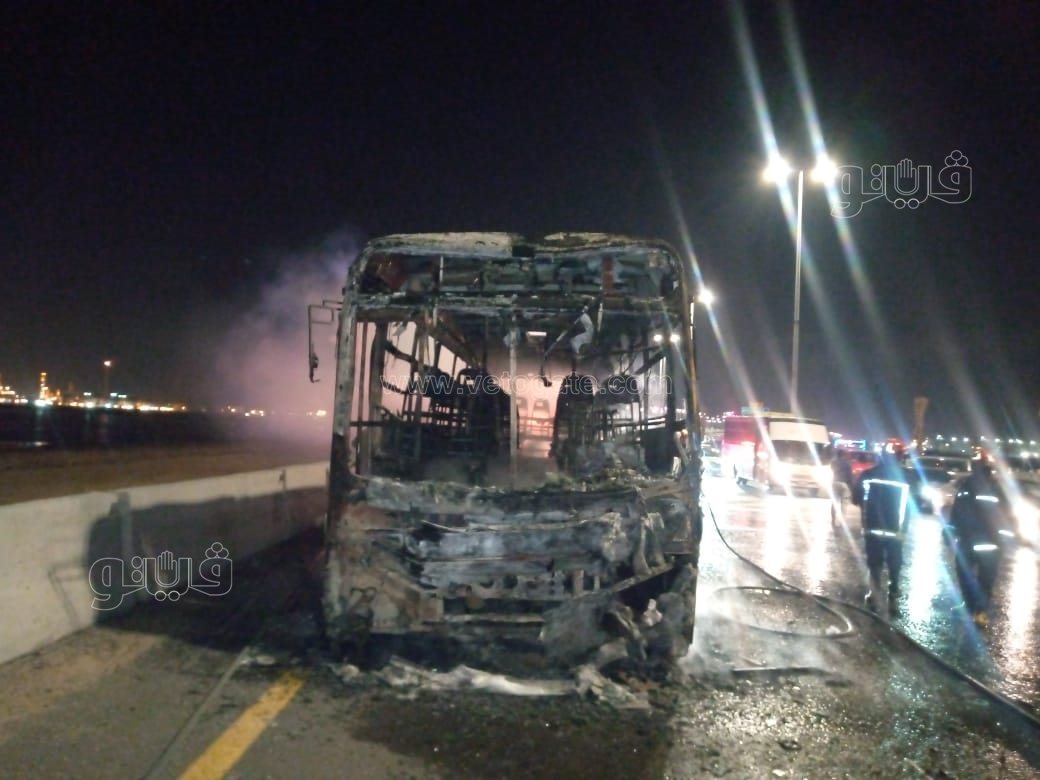 وتبين نشوب حريق هائل في الاتوبيس، ونجاه السائق والمحصل وعدد من الركاب بعد هروبهم من الاتوبيس، تدخلت سيارات الاطفاء وجري اطفاء الحريق، وكشفت المعاينة الاوليه سبب الحريق لماس كهربائي بالسيارة.