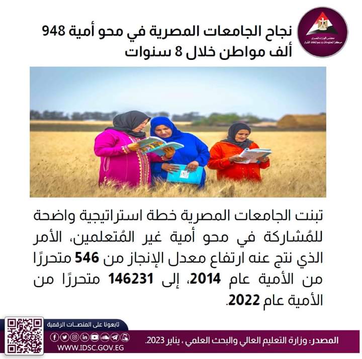 نشرت الصفحة الرسمية لمركز المعلومات ودعم اتخاذ القرار بمجلس الوزراء، إنفوجرافا جديدا تحت عنوان (الجامعات المصرية تنجح في محو أمية 948 ألف مواطن خلال 8 سنوات).