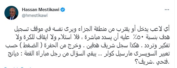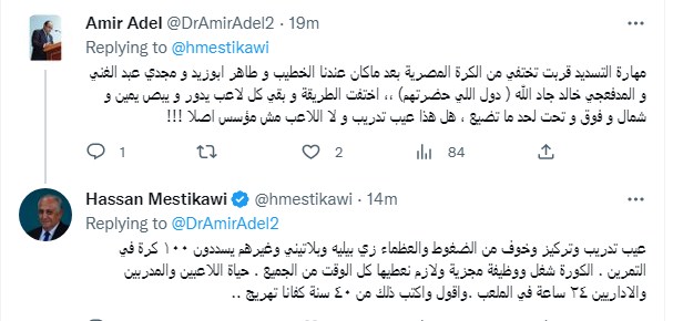 جاء ذلك عندما رد حسن المستكاوي على أحد متابعيه الذي قال: "مهارة التسديد قربت تختفي من الكرة المصرية بعد ماكان عندنا الخطيب وطاهر ابوزيد ومجدي عبد الغني والمدفعجي خالد جاد الله (دول اللي حضرتهم)، اختفت الطريقة وبقي كل لاعب يدور ويبص يمين وشمال وفوق وتحت لحد ما تضيع، هل هذا عيب تدريب ولا اللاعب مش مؤسس اصلا!"