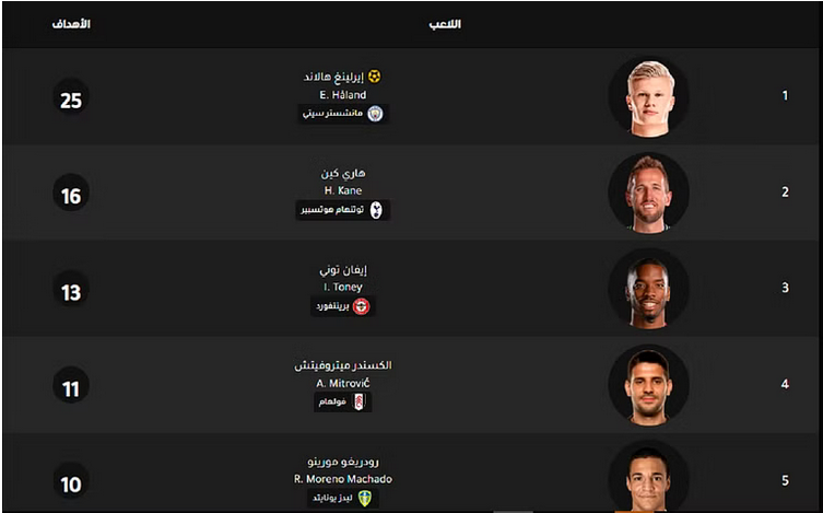 وجاء جدول ترتيب هدافي الدوري الإنجليزي 2023 كالتالي: