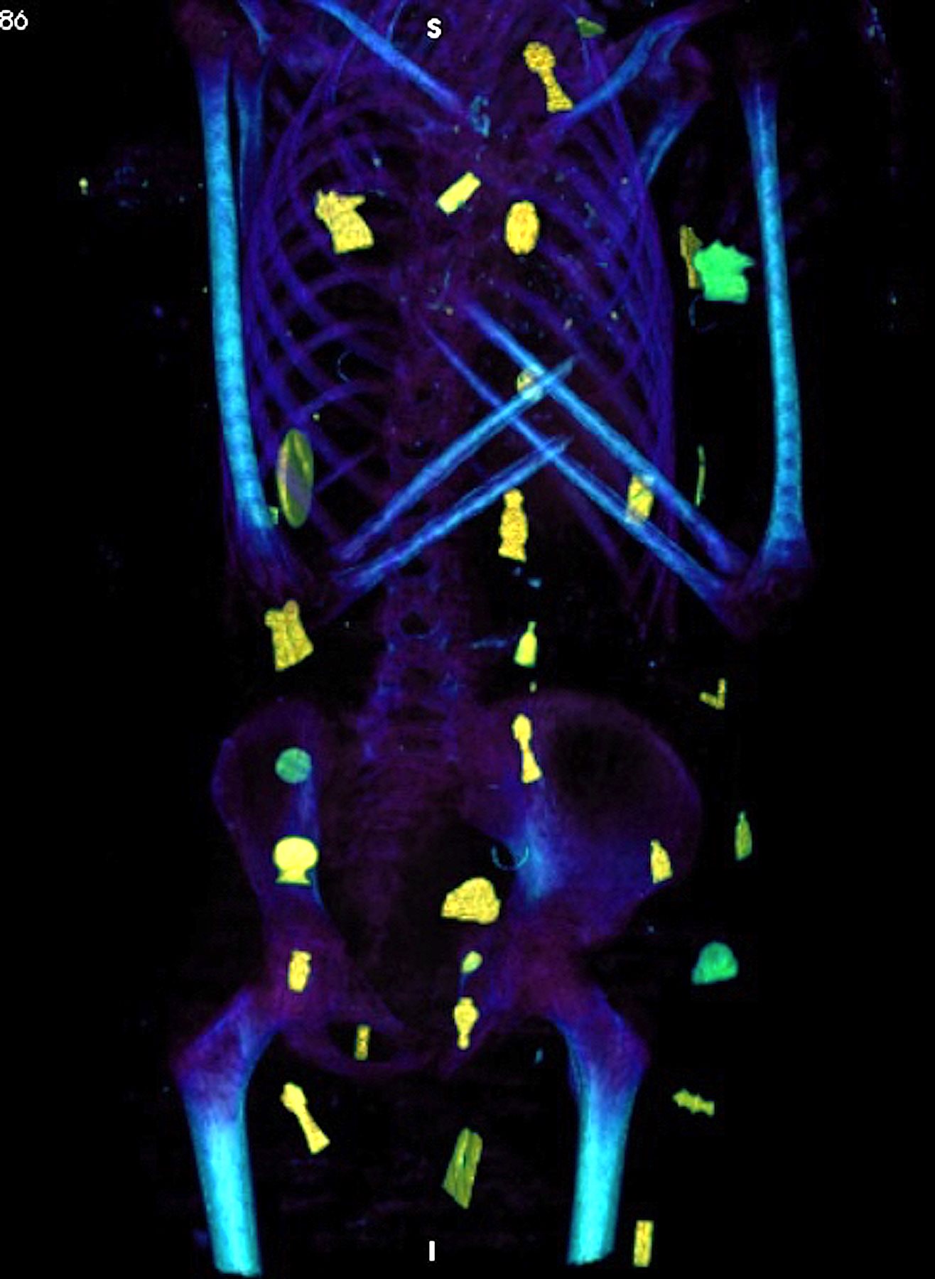 كما أوضحت صور الأشعات المقطعية الثنائية والثلاثية الأبعاد عن وجود حوالي 49 تميمة مرتبة ترتيبًا منمقًا في ثلاث أعمدة بين طيات اللفائف الكتانية وبداخل تجويف المومياء، كما أظهرت الأشعة أيضا 21 شكلًا مختلفًا للتمائم مثل عين المعبود حورس والجعران وتميمة الأفق والمشيمة وعقدة إيزيس والريشتان، وغيرهم.