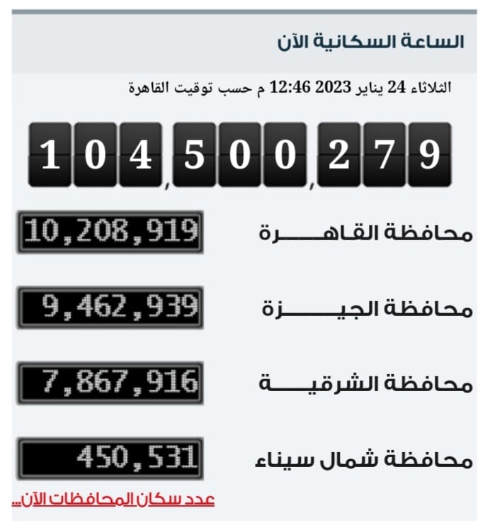 تعداد سكان مصر، أعلنت الساعة السكانية أعلى مبنى الجهاز المركزي للتعبئة العامة والإحصاء اليوم عن وصول عدد سكان مصر بالداخل إلى 104 ملايين و500 ألف نسمة بزيادة قدرها 500 ألف نسمة خلال 115 يوما؛ حيث سجل عدد سكان مصر 104 ملايين نسمة بالداخل في الأول من أكتوبر من العام الجاري.