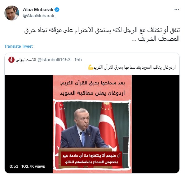 وكتب علاء مبارك تغريدة على تويتر وجه فيها رسالة لأردوغان فقال: "تتفق أو تختلف مع الرجل لكنه يستحق الاحترام على موقفه تجاه حرق المصحف الشريف.."