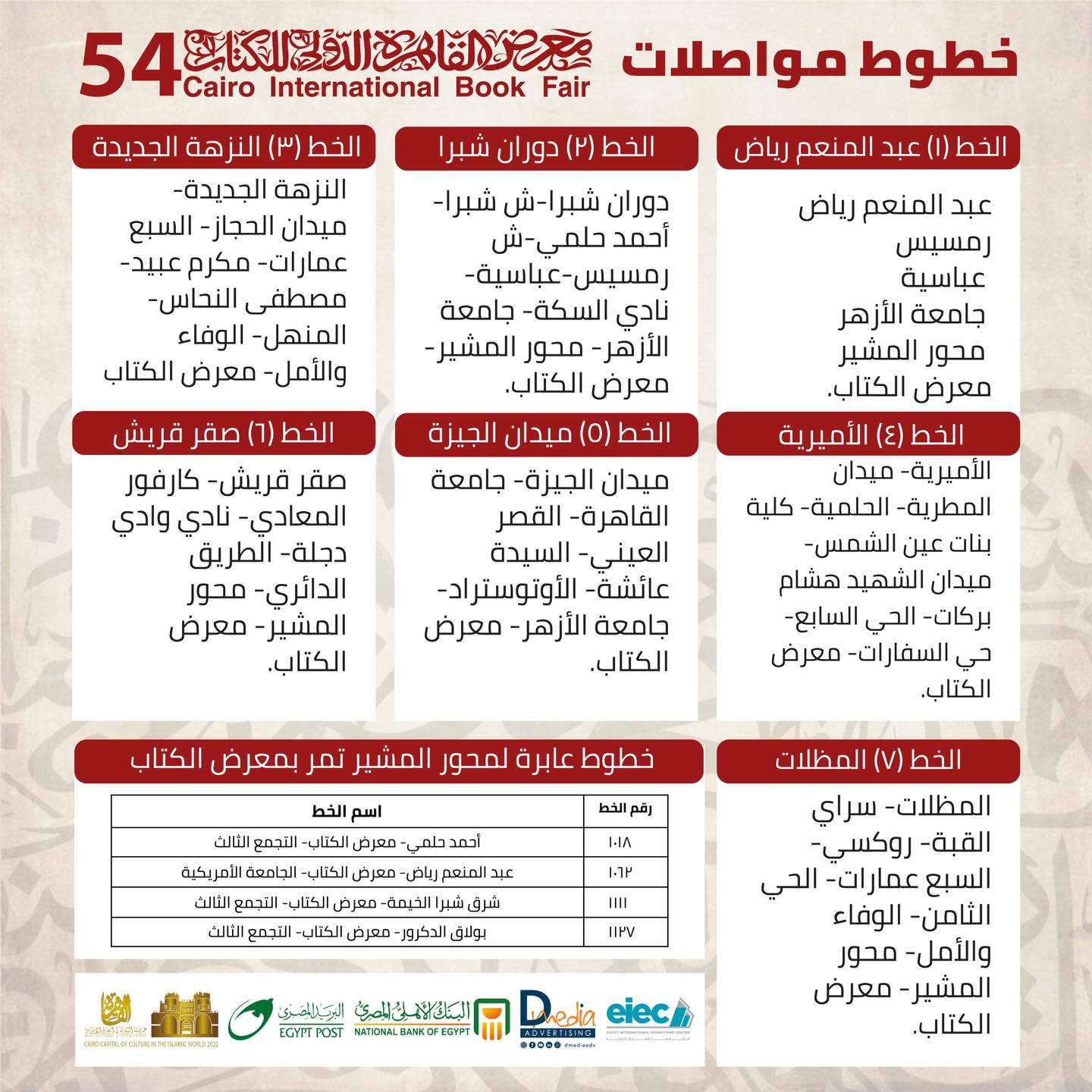 ويمكن أيضًا الوصول إلى معرض القاهرة للكتاب 2023 من خلال التوجه إلى محطة الشهداء بالخط الثاني لمترو الأنفاق، أو محطة مترو كوبري القبة واستقلال أتوبيسات التجمع الخامس الخامس.. وجميع أسعار التذاكر موحدة وهى 10 جنيهًا.