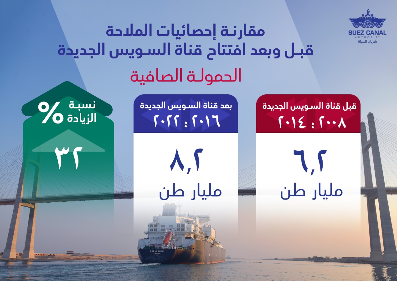 وعبرت القناة خلال تلك الفترة 135 ألف سفينة مقابل عبور 125 ألف سفينة خلال السبع سنوات السابقة لافتتاح قناة السويس الجديدة في الفترة من ( 2008_ 2014)، بنسبة زيادة قدرها 8%، فيما بلغت إجمالي الحمولات الصافية العابرة للقناة بعد افتتاح مشروع قناة السويس الجديدة خلال الأعوام من ( 2016_ 2022) ما يزيد عن 8.2 مليار طن، مقابل 6.2 مليار طن خلال الأعوام (2008_ 2014) بفارق 2 مليار طن، بنسبة زيادة قدرها 32%.