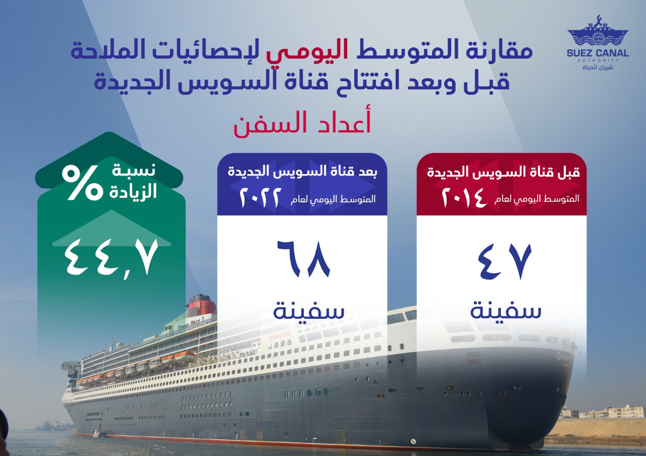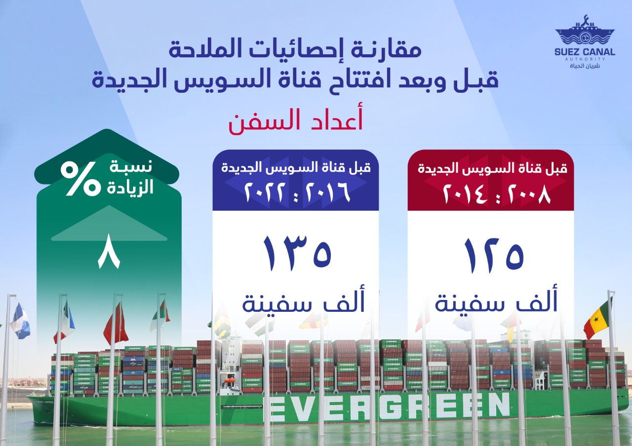 رصدت التقارير الملاحية لهيئة قناة السويس، خلال الأعوام السبعة التالية لافتتاح مشروع قناة السويس الجديدة من ( 2016_2022) طفرة كبيرة في أعداد السفن العابرة للقناة.