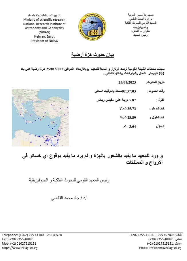 وقال رئيس المعهد القومي للبحوث الفلكية والجيوفيزقية، إنه سجلت محطات الشبكة القومية للزلازل والتابعة للمعهد زلزالا بقوة 6 درجات فى شرق البحر المتوسط ويبعد 502 كم من السواحل المصرية وعمق 54 كم، وقد شعر به عدد من المواطنين فى نطاق القاهرة الكبرى دون وقوع أى خسائر او اصابات.