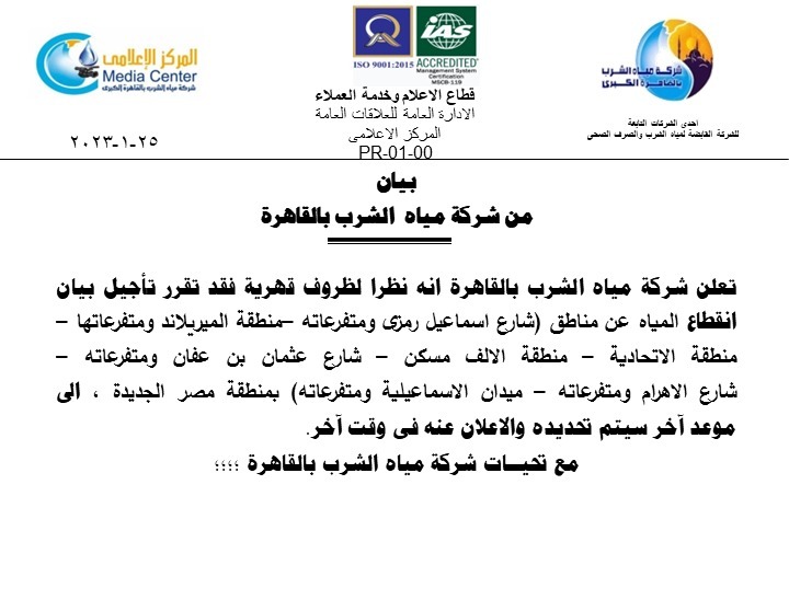 وأوضحت الشركة أنه كان من المقرر قطع المياه اعتبارا من الساعة الثانية ظهرا يوم الجمعة الموافق 27-1-2023 وحتى الساعة الثانية صباح اليوم التالى السبت الموافق 28-1-2023.