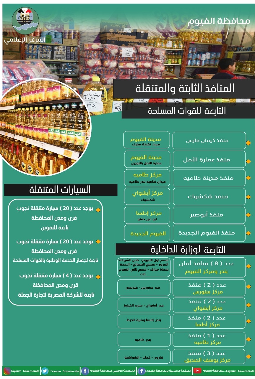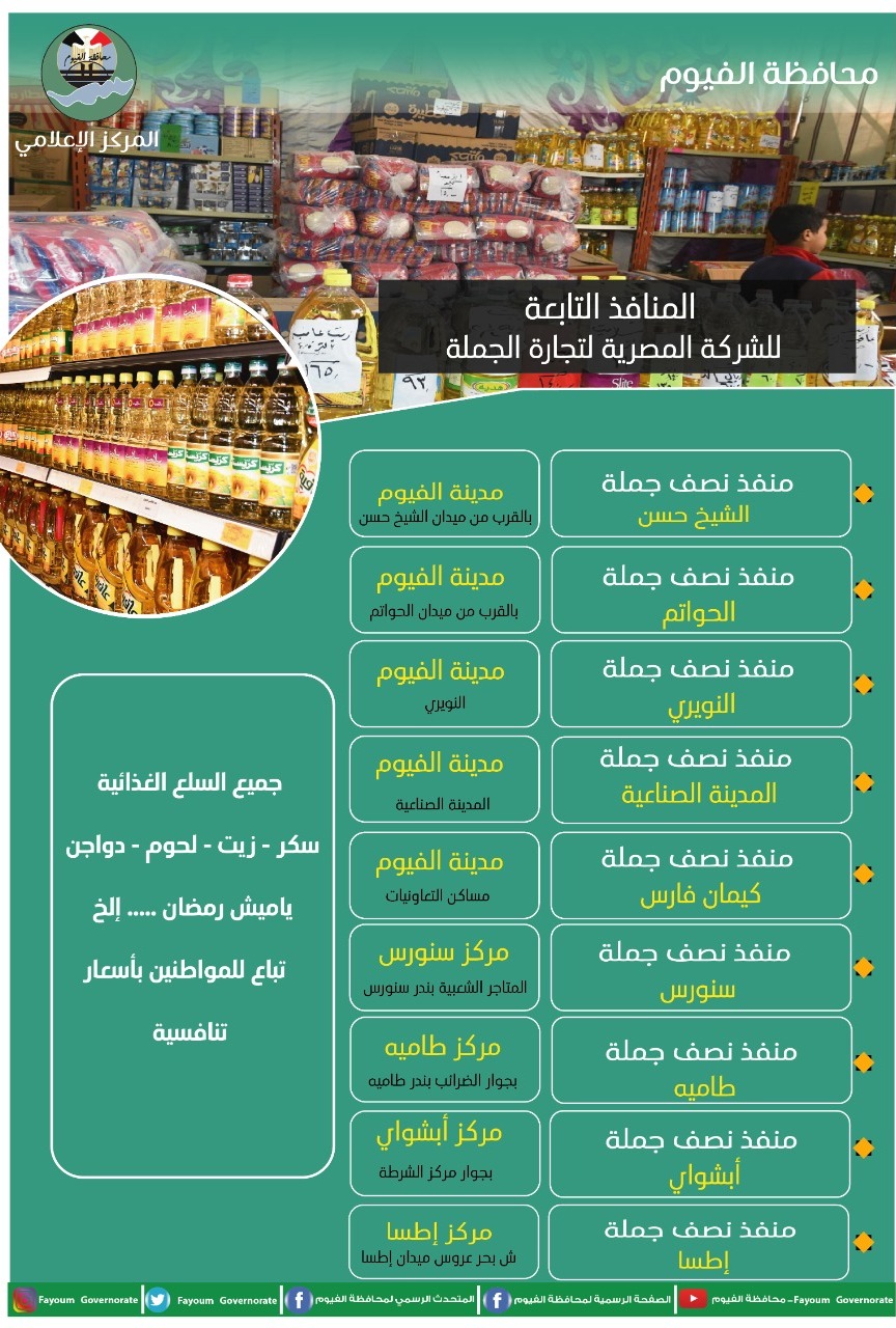 قال الدكتور محمد التوني معاون محافظ الفيوم، المتحدث الرسمي باسم المحافظة، إنه تم نشر 29 معرضا للسلع المخفضة" اهلا رمضان" بقرى ومدن المحافظة، منها 10 معارض ومنافذ بيع بمدينة الفيوم، ومعرض واحد بمدينة الفيوم الجديدة، و5 معارض ومنافذ بمدينة وقرى مركز اطسا، و2 بمركز يوسف الصديق، و4 بمدينة وقرى مركز ابشواي، و4 بمركز وقري طامية، و3 معارض ومنافذ بقري ومدينة مركز سنوري.