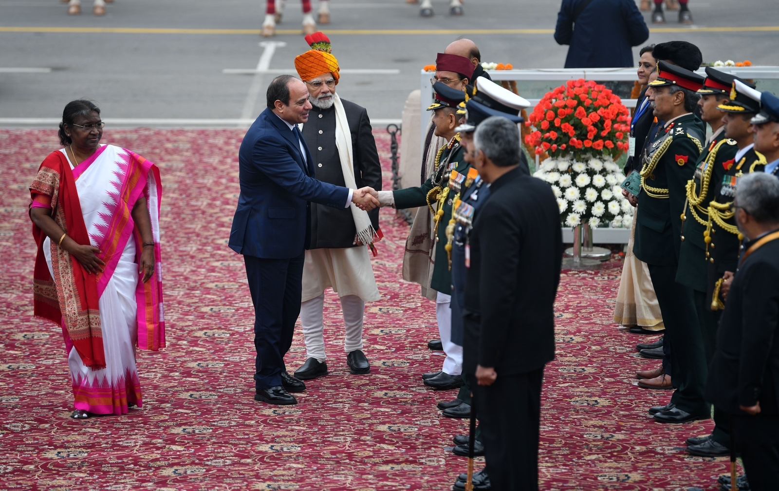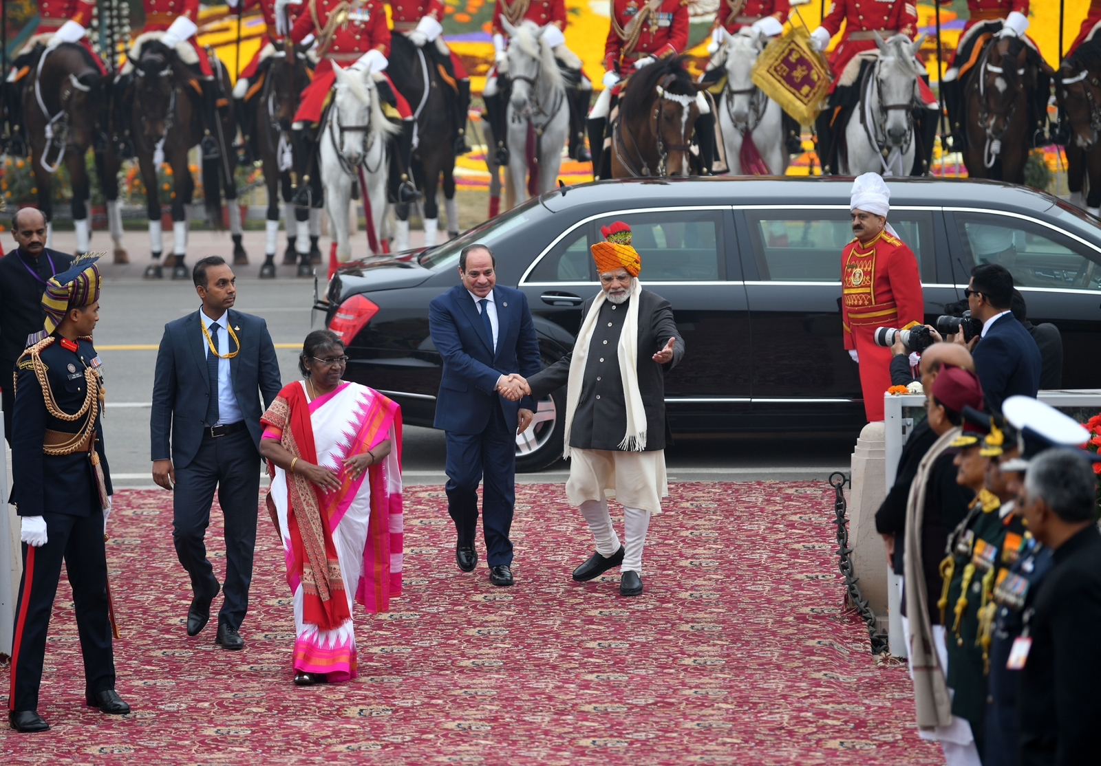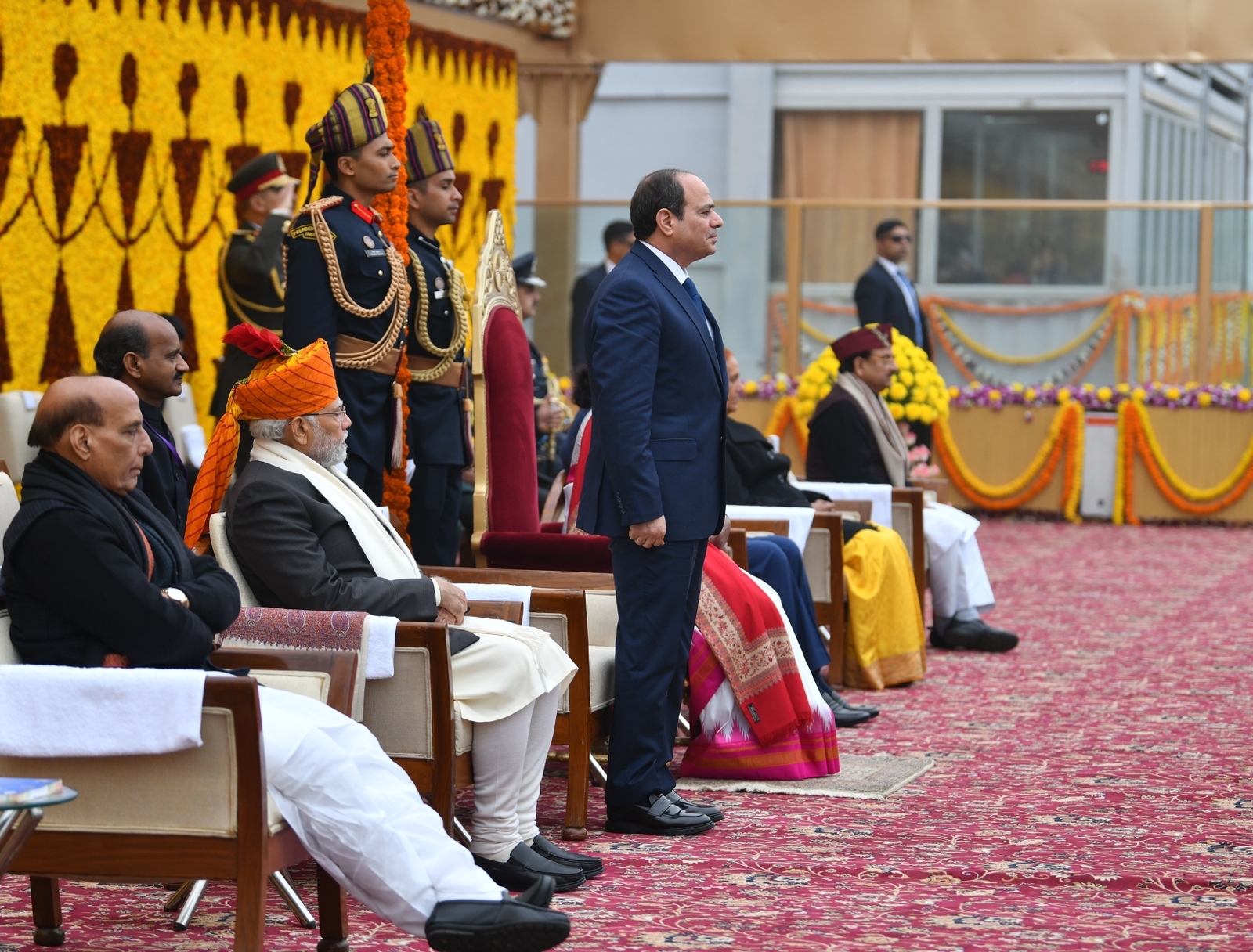 شارك الرئيس عبد الفتاح السيسي في فعاليات احتفالات الهند بعيد الجمهورية كضيف شرف بدعوة من رئيس الوزراء الهندي ناريندرا مودى حيث استعرضت القوات المسلحة الهندية أحدث أسلحتها ومعداتها خلال الفعاليات كما عزفت فرقة الموسيقى العسكرية السلام الوطني لجمهورية مصر العربية كما تم رفع العلم المصري خلال عزف السلام الوطني.