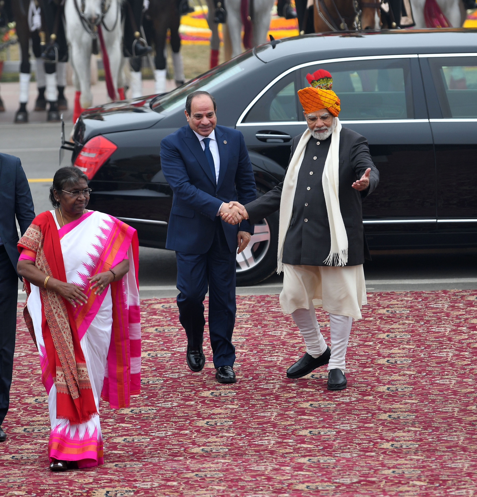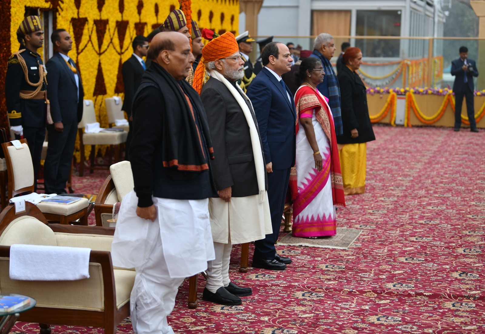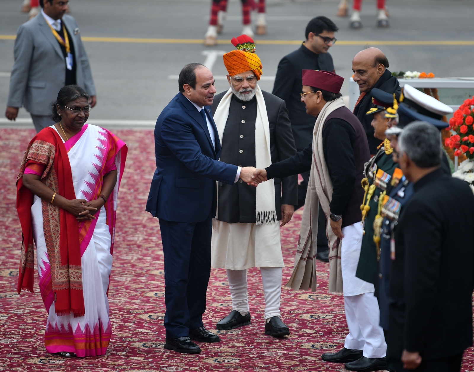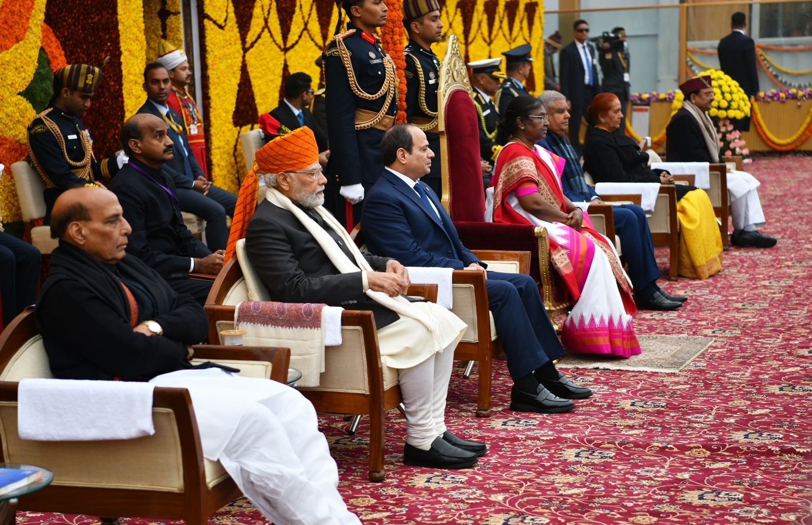 شارك الرئيس عبد الفتاح السيسي في فعاليات احتفالات الهند بعيد الجمهورية كضيف شرف بدعوة من رئيس الوزراء الهندي ناريندرا مودى حيث استعرضت القوات المسلحة الهندية أحدث أسلحتها ومعداتها خلال الفعاليات كما عزفت فرقة الموسيقى العسكرية السلام الوطني لجمهورية مصر العربية كما تم رفع العلم المصري خلال عزف السلام الوطني.
