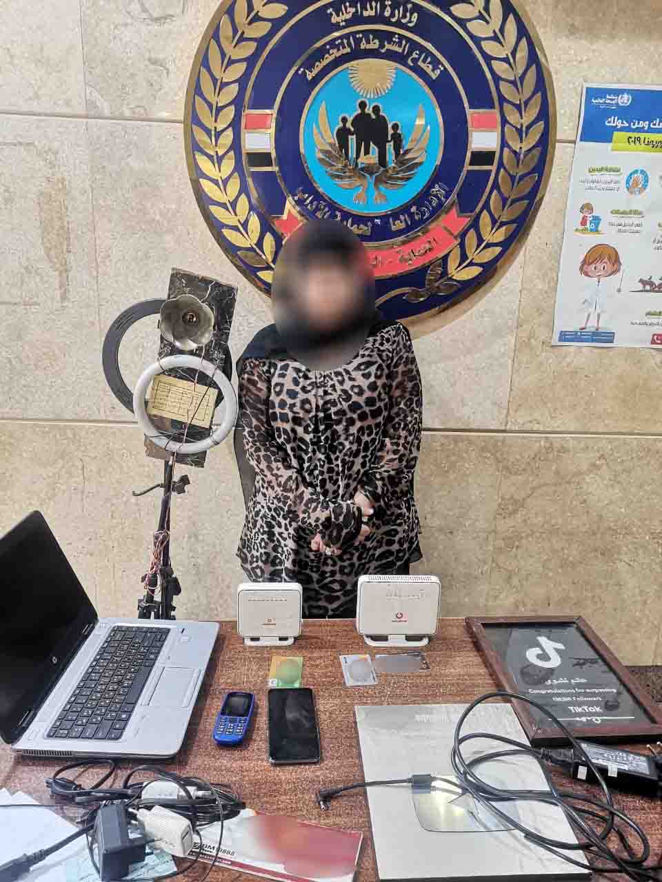 وعقب تقنين الإجراءات تم استهدافها وضبطها، وبحوزتها (2 هاتف محمول "به مقاطع فيديو وصور" تؤكد نشاطها الآثم – جهاز "لاب توب" – 2 راوتر- 3 كارت فيزا – 2 إستاند تصوير- دائرة إضاءة).