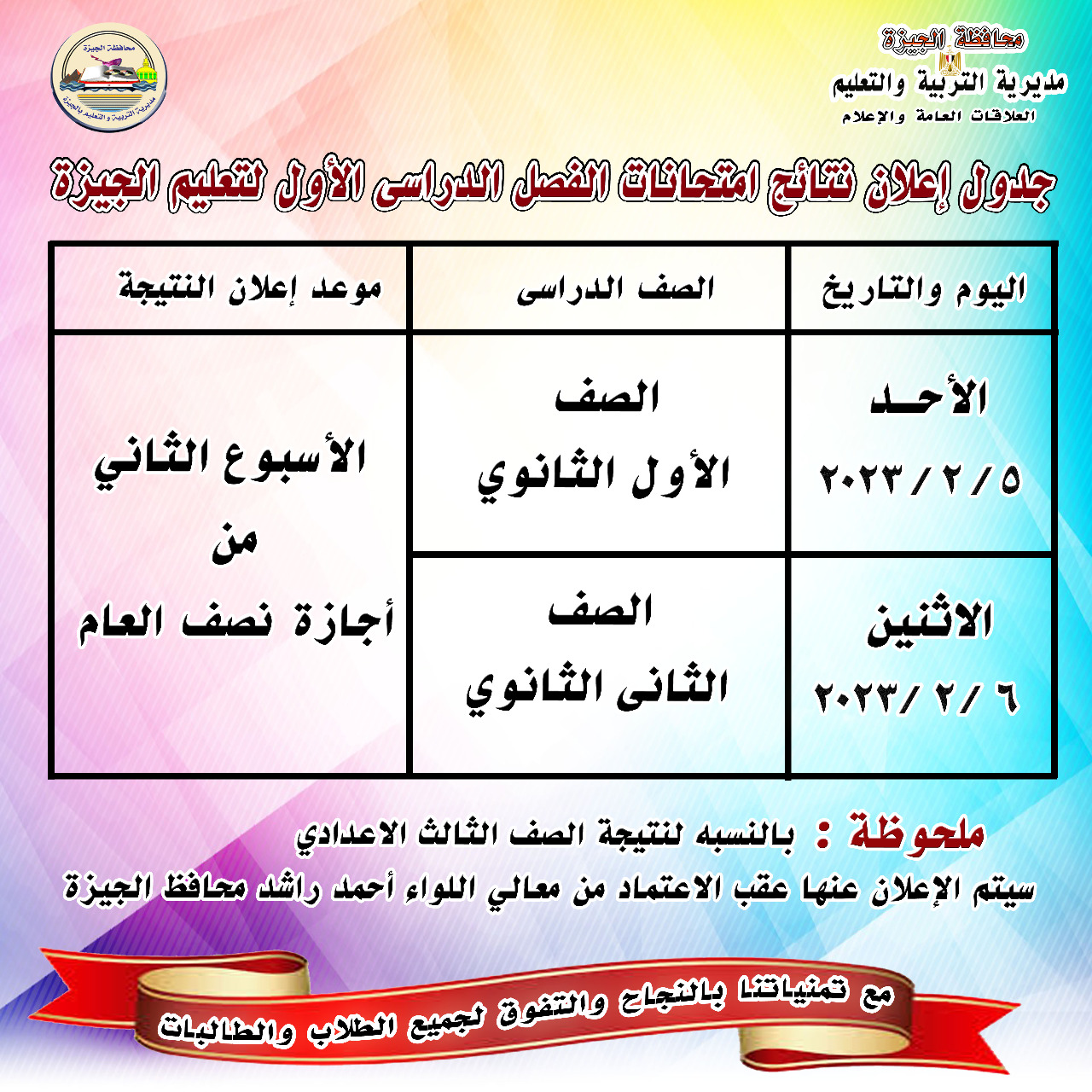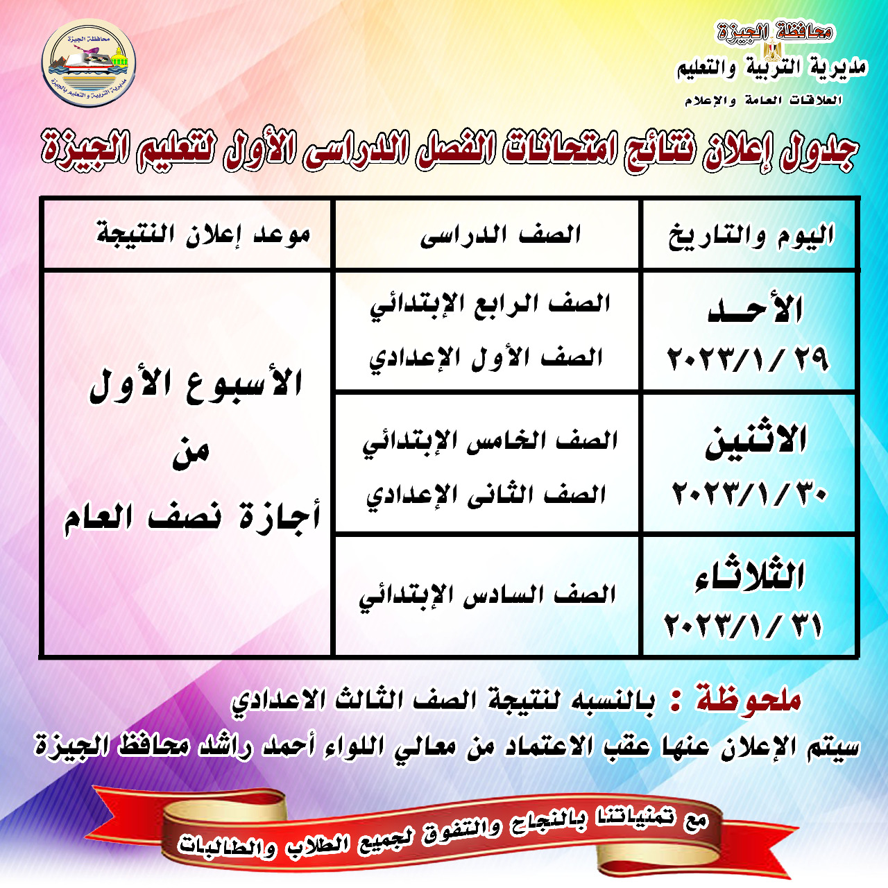 ونشرت تعليم الجيزة جداول إعلان نتائج امتحانات الترم الأول 2023.