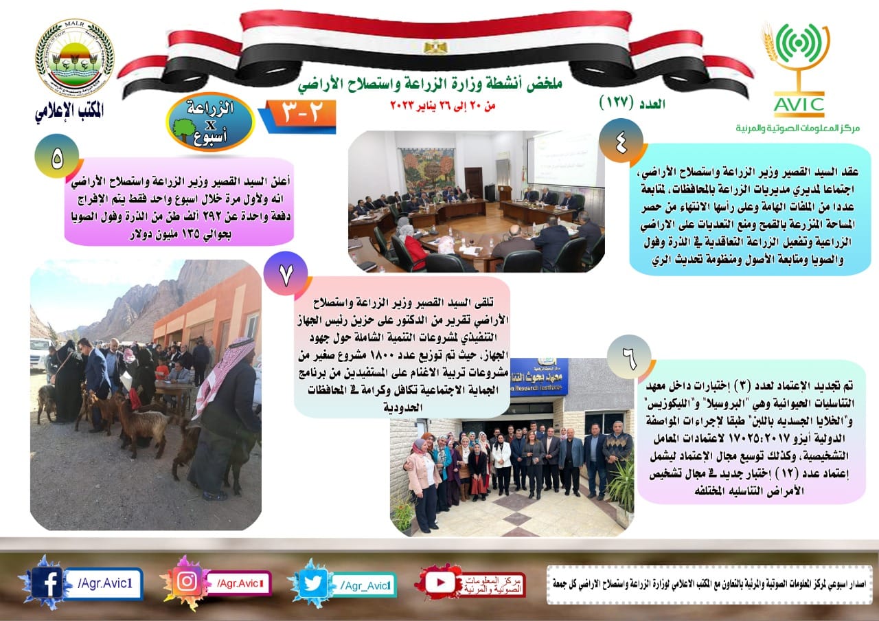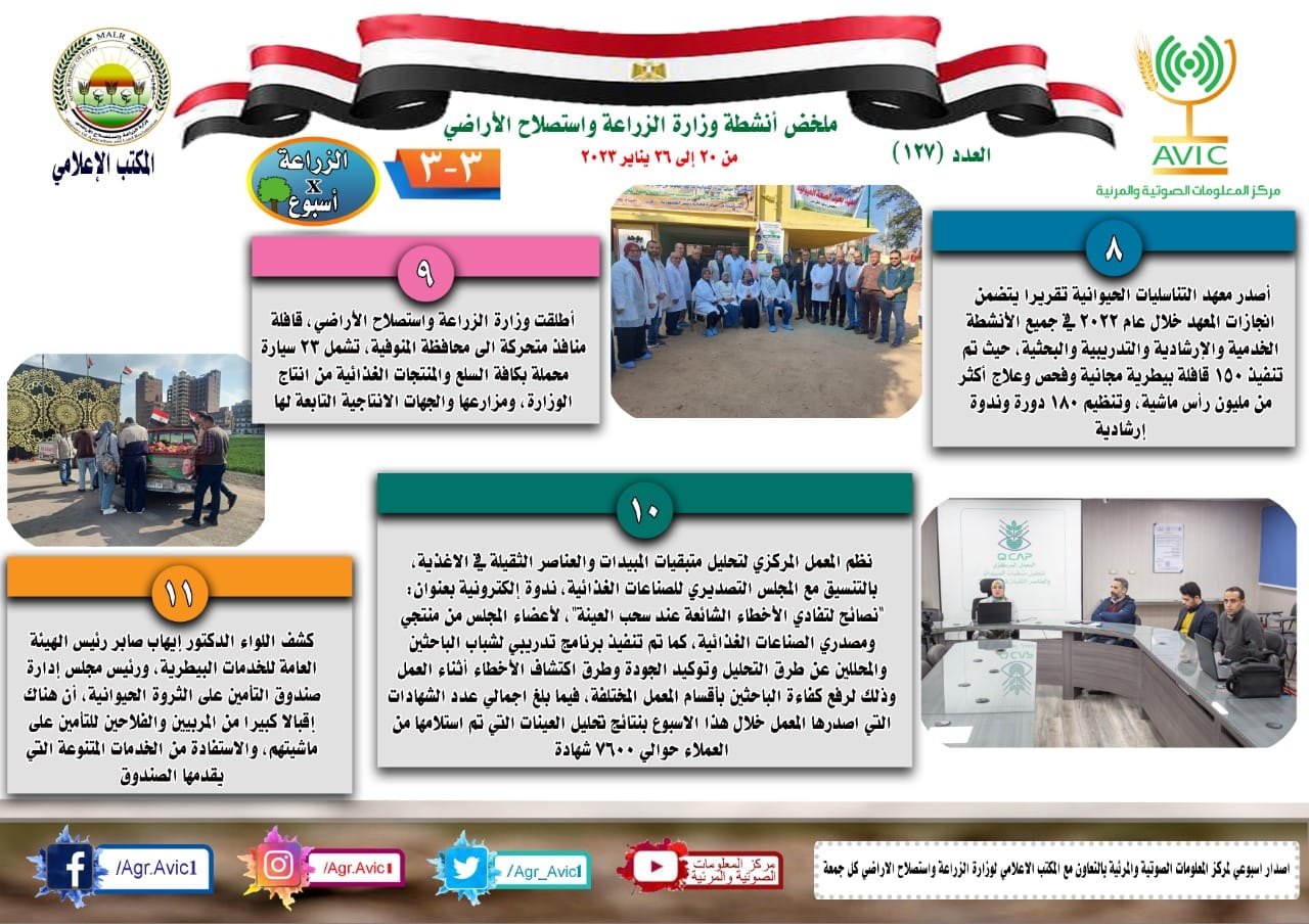 أصدر مركز المعلومات الصوتية والمرئية، التابع لوزارة الزراعة واستصلاح الأراضي، "الانفوجراف الأسبوعي" في نسخته رقم ١٢٧، حول الحصاد الأسبوعي لأهم أنشطة الوزارة، خلال الأسبوع الماضي في الفترة من ٢٠ إلى ٢٦ يناير الجاري، وذلك بالتعاون مع المكتب الإعلامي للوزارة، كما أصدر المركز أيضا ملخصا بالفيديو، حول أنشطة الوزارة خلال نفس الفترة.