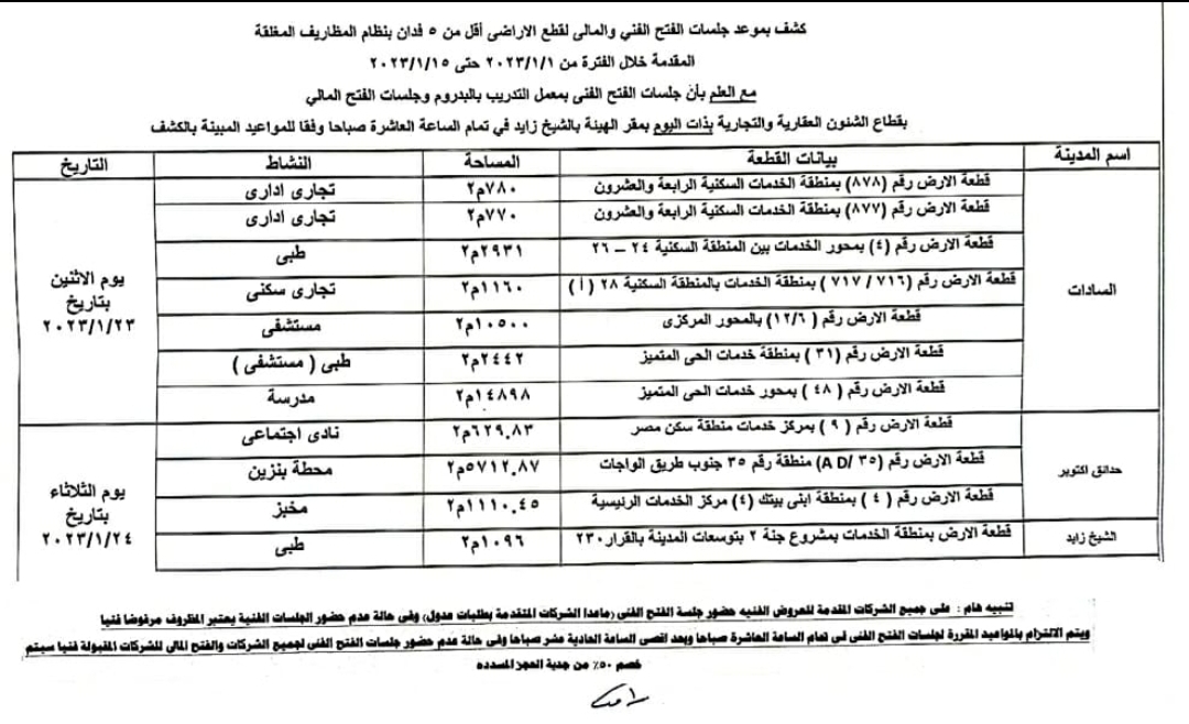 أراضي الإسكان، تعقد وزارة الإسكان متمثلة في هيئة المجتمعات العمرانية جلسات الفتح الفني والمالي لقطع الاراضى أقل من ٥ فدان بنظام المظاريف المغلقة المقدمة خلال الفترة من ۲۰۲۳/۱/۱ حتي ۲۰۲۳/۱/۱٥ وذلك في مدينة السادات وحدائق أكتوبر والشيخ زايد بمختلف المساحات والأنشطة مع العلم بأن جلسات الفتح الفني بمعمل التدريب بالبدروم وجلسات الفتح المالي بقطاع الشئون العقارية والتجارية بذات اليوم بمقر الهيئة بالشيخ زايد في تمام الساعة العاشرة صباحا وفقا للمواعيد المبينة بالكشف.