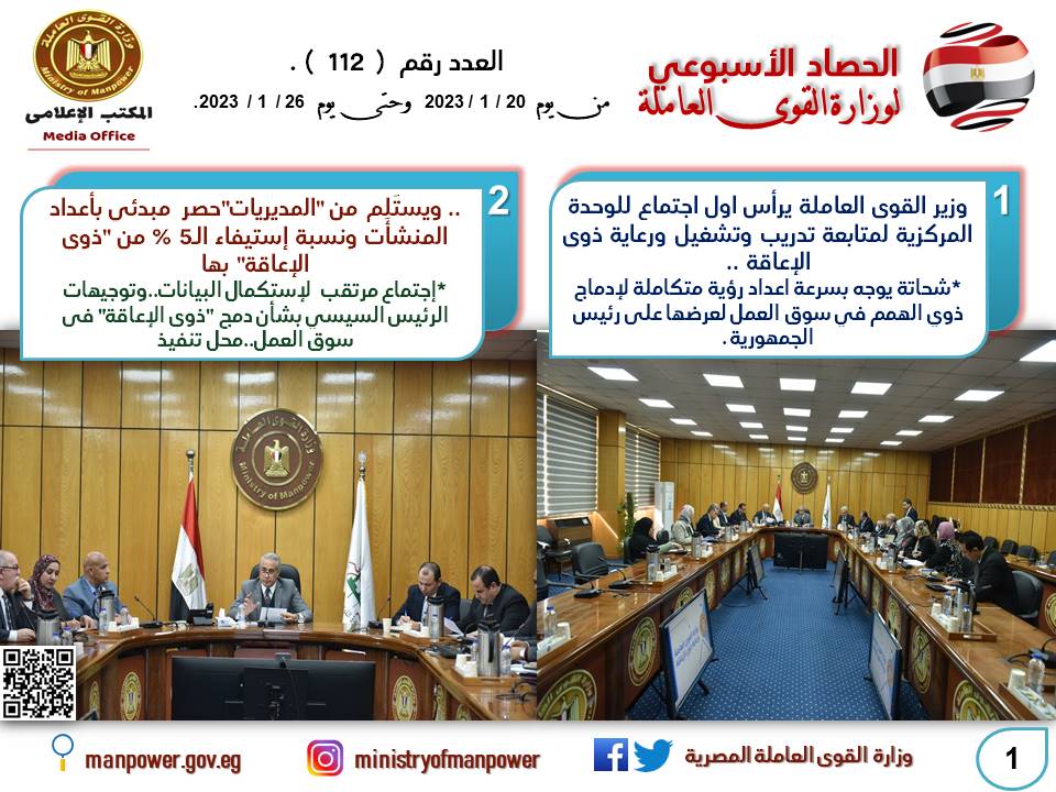 كما تسلم وزير القوى العاملة حسن شحاتة من مديري المديريات بالمحافظات،حصر مبدئي وأرقام أولية بأعداد المنشأت،وعدد العمالة بها،ونسبة إستيفاء الـ5% للأشخاص ذوي الإعاقة فيها،وتحديد النِسب المتبقية،تمهيداَ للإنتهاء من قاعدة بيانات كاملة بشأن المنشأت والأعدد المطلوب تعينها طبقا للقانون رقم 10 لسنة 2018،الخاص بذوي الإعاقة، ووجه "الوزير"مديري المديريات بسرعة الإنتهاء من باقي الحصر،وعرضه في إجتماع يوم الأحد المُقبل،وناقش "الوزير" التقارير المقدمة من كل مديرية فيما يخص عمليات الحصر والارقام المسجلة فى تقارير المديريات الخاصة بذوى الإعاقة، مع تحديد المدد المتبقية لباقى المديريات التى يوجد بها كثافة فى عدد المنشآت المطلوب منها تشغيل هذه الفئة،مؤكدًا على أن قاعدة البيانات المرتقبة ستكون بالأسماء بالأرقام،وأن "ذوي الهمم" دائما في قلب "القوى العاملة" ومحل متابعة.