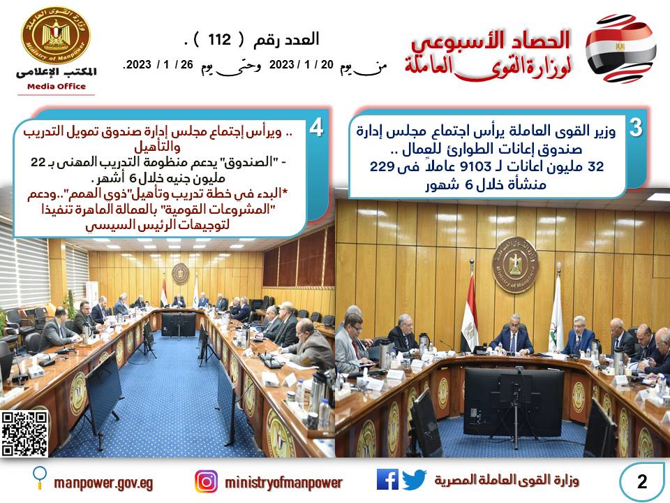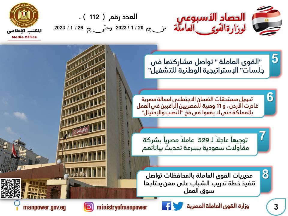 تنشر وزارة القوى العاملة اليوم الجمعة وفي هذا البيان، وبالإنفوجراف،حصاد نشاطها خلال الـ7 أيام الماضية،والذي يرصد الأنشطة والتوجهات التي تنفذها الوزارة لخدمة الوطن والمواطن،ويُمكن التأكيد من خلال ذلك الحصاد على حرص الوزير حسن شحاتة وزير القوى العاملة على التركيز على ملفات تتماشى مع الاتجاه العام للدولة المصرية في الحماية والرعاية والدعم.