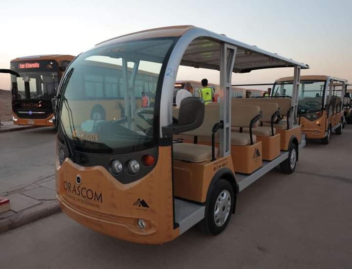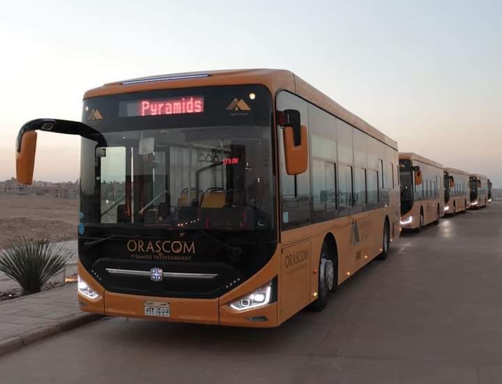 وأعلنت شركة أوراسكوم للاستثمار القابضة عن التشغيل التجريبي لأول مجموعة من منظومة الحافلات والسيارات الكهربائية الصديقة للبيئة، وساحة الانتظار بمحطة مركز الزوار والتي تسع لما يقرب من 1000 سيارة وحافلة بهدف خدمة زائري منطقة بأهرامات الجيزة، والذين سوف يتمتعون بتجربة سياحية متميزة حيث يمكنهم مشاهدة المواقع الأثرية المختلفة بالمنطقة، عبر هذه الحافلات والسيارات الكهربائية، والتي تأخذهم في جولة بمسار منطقة الزيارة من خلال 7 محطات رئيسية لتبدأ من محطة مركز الزوار مرورًا بمحطة بانوراما 1، ثم محطة منكاورع ومحطة خفرع ثم محطة خوفو، ثم محطة أبو الهول، لتنتهي عند محطة بانوراما ٤ قبل العودة لمركز الزوار.
