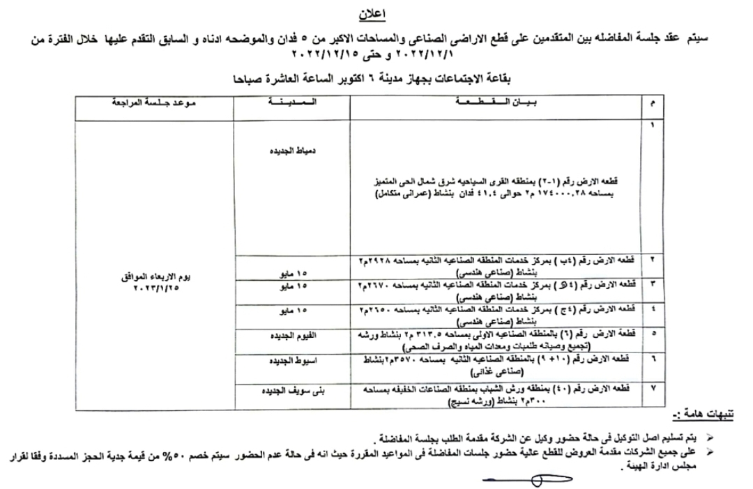 أراضي الإسكان، تعقد وزارة الإسكان متمثلة في هيئة المجتمعات العمرانية جلسة المفاضلة بين المتقدمين على قطع الأراضي الصناعية والمساحات الأكبر من ٥ أفدنة والسابق التقدم عليها خلال الفترة من ۲۰۲۲/۱۲/۱ وحتی ۲۰۲۲/۱۲/١٥ بقاعة الاجتماعات بجهاز مدينة ٦ أكتوبر الساعة العاشرة صباحًا وذلك بقطع الأراضي في مدن الدمياط الجديدة و١٥ مايو والفيوم الجديدة وأسيوط الجديدة وبني سويف الجديدة موضحة موعد الجلسة على أن يتم عقد الجلسة يوم الأربعاء الموافق ٢٥-١-٢٠٢٣.