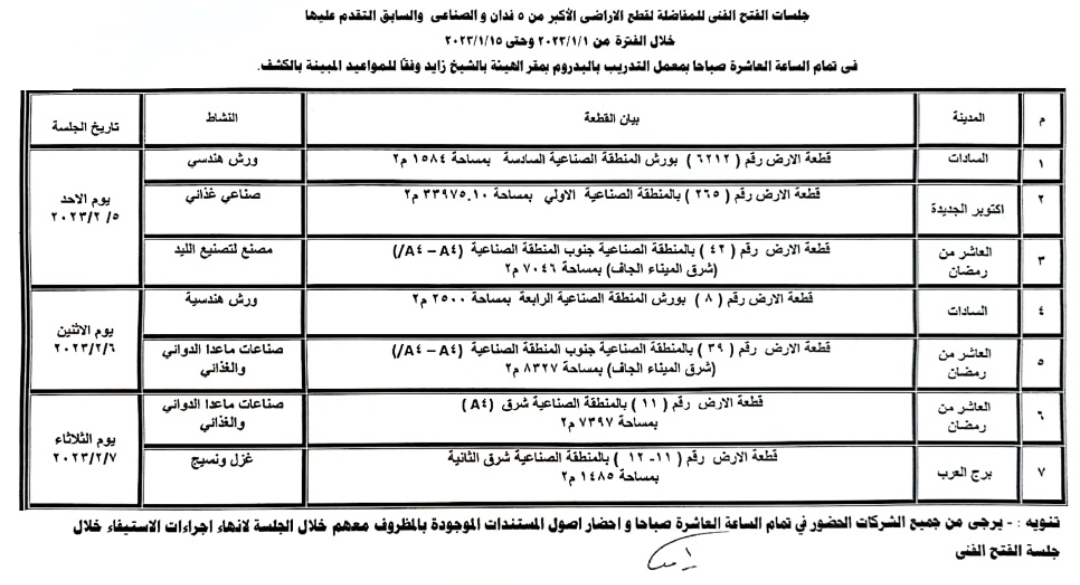أراض الإسكان، تعقد وزارة الإسكان متمثلة في هيئة المجتمعات العمرانية جلسات الفتح الفني للمفاضلة لقطع الأراضي الأكبر من ٥ أفدنة والسابق التقدم عليها خلال الفترة من ۲۰۲۳/۱/۱ وحتى ۲۰۲۳/۱/۱٥ في تمام الساعة العاشرة صباحا بمعمل التدريب بالبدروم بمقر الهيئة بالشيخ زايد وفقا للمواعيد المبينة بالكشف وذلك بقطع الأراضي بنشاط صناعي وذلك بمدن السادات والعاشر من رمضان وأكتوبر الجديدة وبرج العرب.