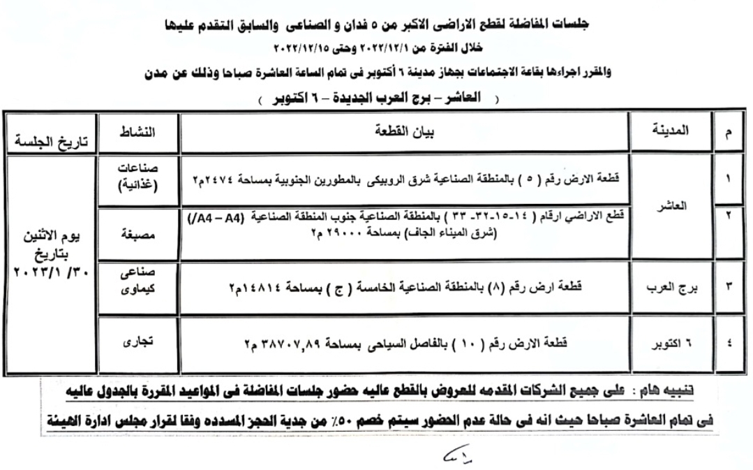 أراض الإسكان، ععقدت وزارة الإسكان متمثلة في هيئة المجتمعات العمرانية جلسات المفاضلة لقطع الأراضى الأكبر من ٥ فدان ذات النشاط الصناعي والسابق التقدم عليها خلال الفترة من ۲۰۲۲/۱۲/۱ وحتى ٢٠٢٢/١٢/١٥ والمقرر إجراؤها بقاعة الاجتماعات بجهاز مدينة ٦ أكتوبر فى تمام الساعة العاشرة صباحا عن مدن( العاشر - برج العرب الجديدة - ٦ اكتوبر ) وذلك اليوم الإثنين.