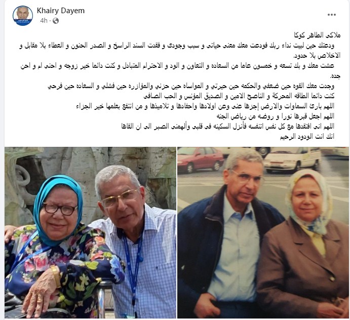 وعن رسالته المؤثرة والمبكية في آن واحد قال الدكتور خيري عبد الدايم: "ملاكى الطاهر كوكا ودعتك حين لبيت نداء ربك فودعت معك معنى حياتى وسبب وجودى وفقدت السند الراسخ والصدر الحنون والعطاء بلا مقابل والإخلاص بلا حدود."