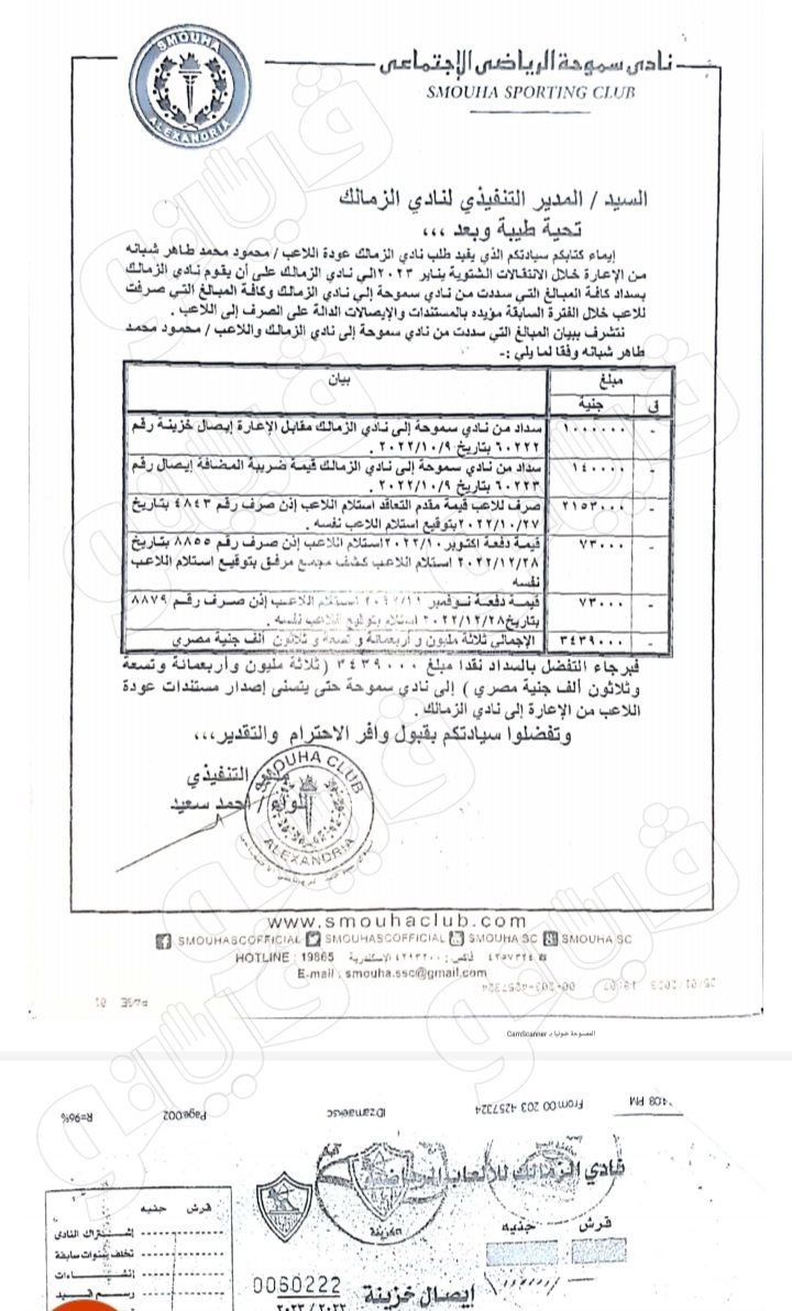 أخبار الزمالك، أرسل مسئولو نادي الزمالك برئاسة المستشار مرتضى منصور، اليوم الأحد، مليون جنيه إلى نادي سموحة مقابل قطع إعارة محمود شبانة.