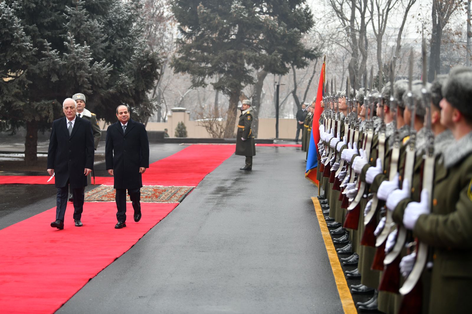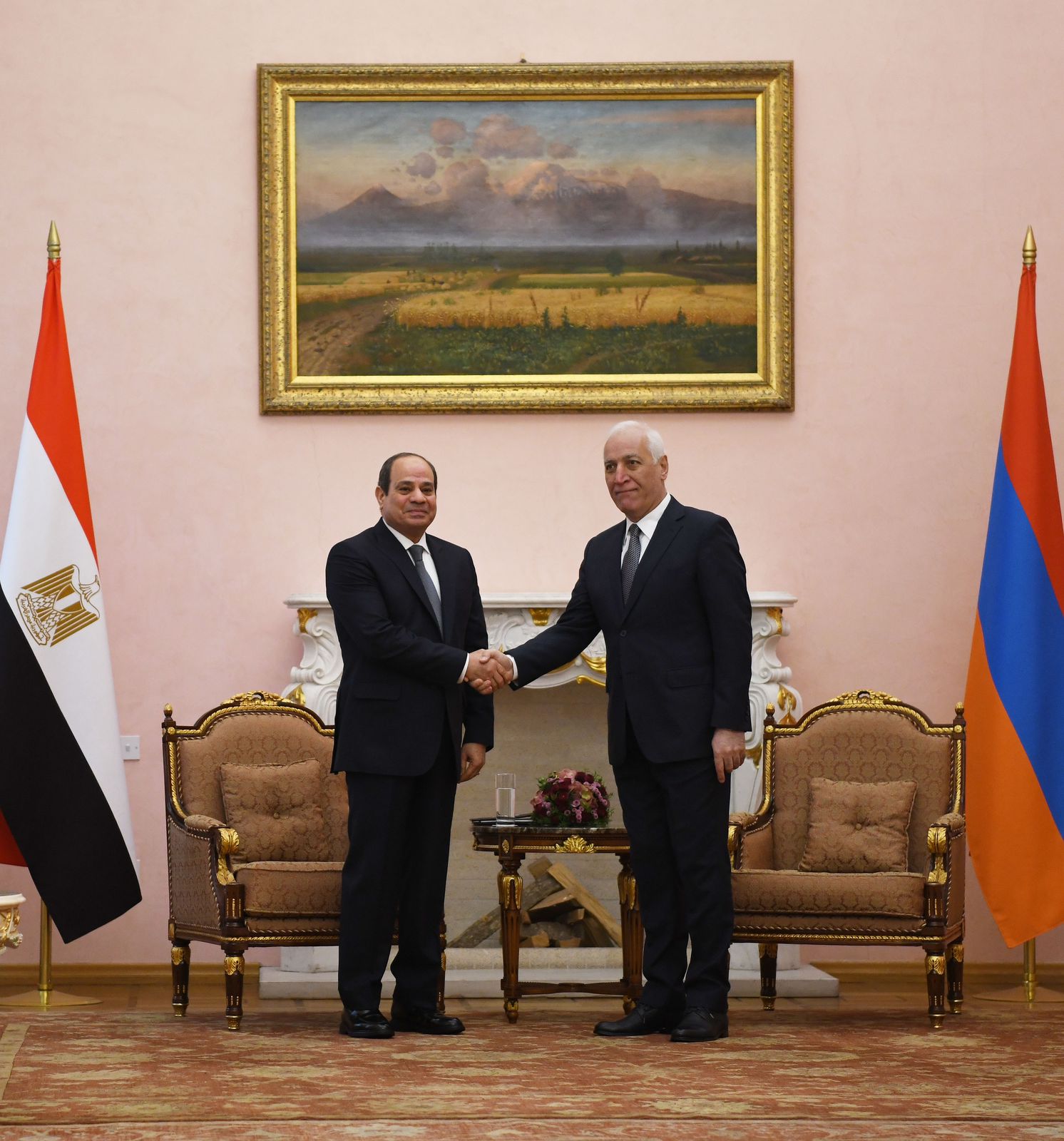 التقى الرئيس عبد الفتاح السيسى اليوم بالقصر الرئاسي في العاصمة الأرمينية بيريفان مع الرئيس "فاهاجن خاتشاتوريان"، رئيس جمهورية أرمينيا، حيث أقيمت للرئيس مراسم الاستقبال الرسمي وتم عزف السلامين الوطنيين واستعراض حرس الشرف.